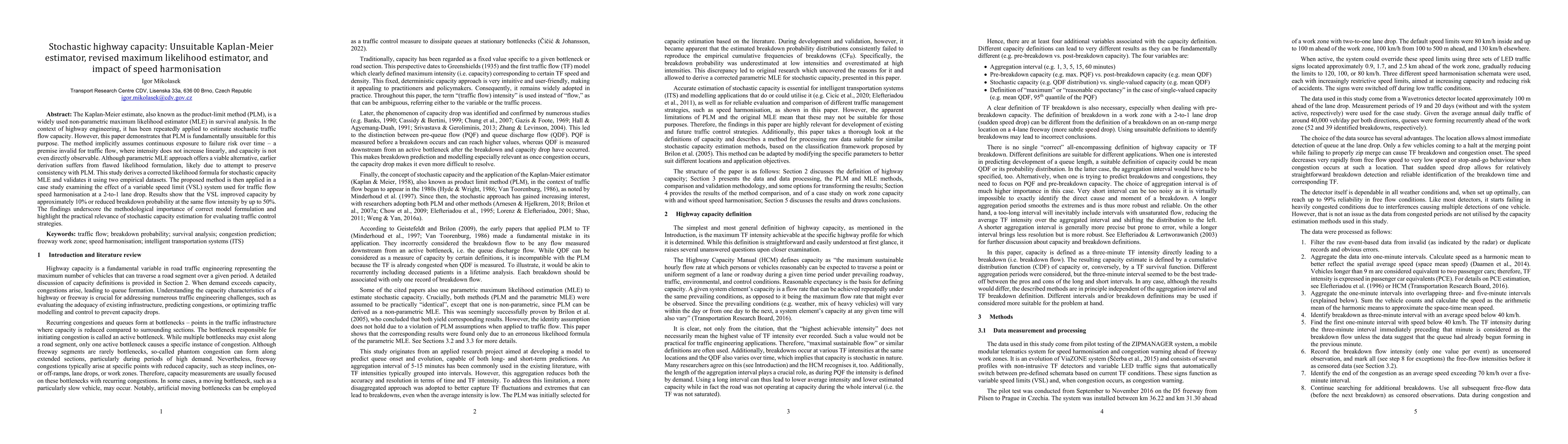 The Kaplan-Meier estimate, also known as the product-limit method (PLM), is a widely used non-parametric maximum likelihood estimator (MLE) in survival analysis. In the context of highway engineering, it has been repeatedly applied to estimate stochastic traffic flow capacity. However, this paper demonstrates that PLM is fundamentally unsuitable for this purpose. The method implicitly assumes continuous exposure to failure risk over time - a premise invalid for traffic flow, where intensity does not increase linearly, and capacity is not even directly observable. Although parametric MLE approach offers a viable alternative, earlier derivation suffers from flawed likelihood formulation, likely due to attempt to preserve consistency with PLM. This study derives a corrected likelihood formula for stochastic capacity MLE and validates it using two empirical datasets. The proposed method is then applied in a case study examining the effect of a variable speed limit (VSL) system used for traffic flow speed harmonisation at a 2 to 1 lane drop. Results show that the VSL improved capacity by approximately 10% or reduced breakdown probability at the same flow intensity by up to 50%. The findings underscore the methodological importance of correct model formulation and highlight the practical relevance of stochastic capacity estimation for evaluating traffic control strategies.