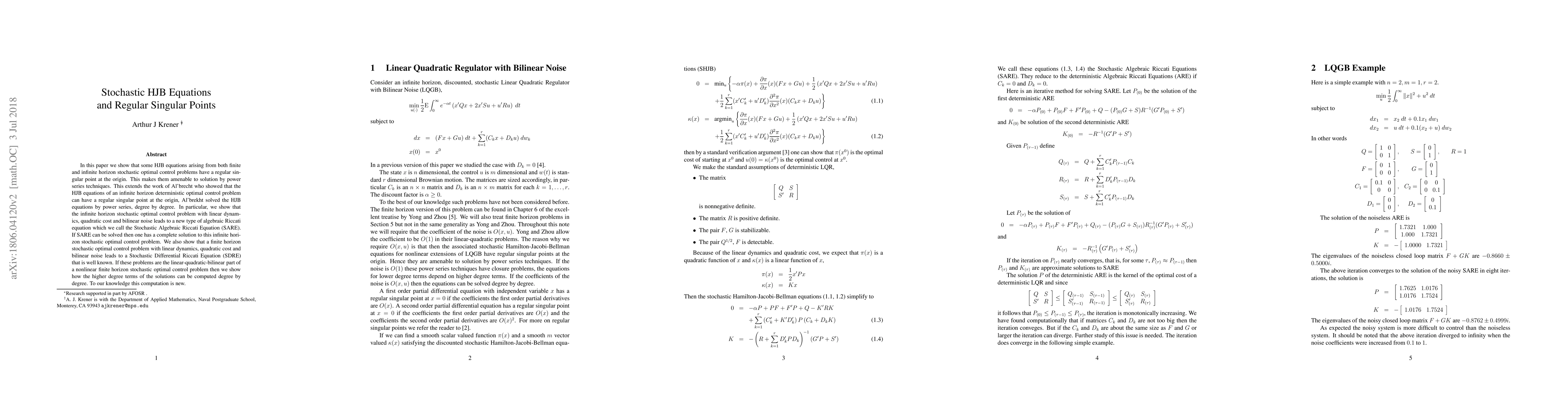 IIn this paper we show that some HJB equations arising from both finite and infinite horizon stochastic optimal control problems have a regular singular point at the origin. This makes them amenable to solution by power series techniques. This extends the work of Al'brecht who showed that the HJB equations of an infinite horizon deterministic optimal control problem can have a regular singular point at the origin, Al'brekht solved the HJB equations by power series, degree by degree. In particular, we show that the infinite horizon stochastic optimal control problem with linear dynamics, quadratic cost and bilinear noise leads to a new type of algebraic Riccati equation which we call the Stochastic Algebraic Riccati Equation (SARE). If SARE can be solved then one has a complete solution to this infinite horizon stochastic optimal control problem. We also show that a finite horizon stochastic optimal control problem with linear dynamics, quadratic cost and bilinear noise leads to a Stochastic Differential Riccati Equation (SDRE) that is well known. If these problems are the linear-quadratic-bilinear part of a nonlinear finite horizon stochastic optimal control problem then we show how the higher degree terms of the solutions can be computed degree by degree. To our knowledge this computation is new.
