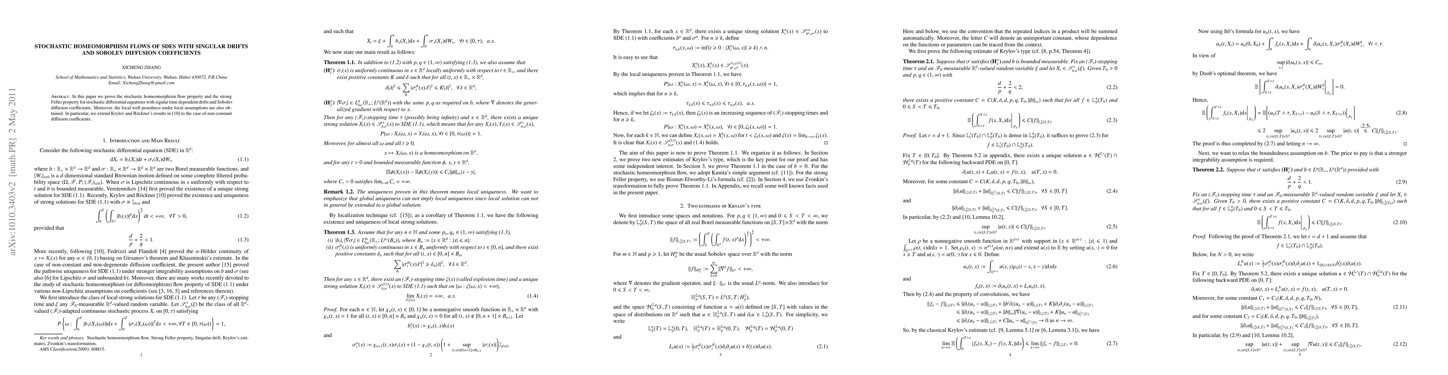 In this paper we prove the stochastic homeomorphism flow property and the strong Feller property for stochastic differential equations with sigular time dependent drifts and Sobolev diffusion coefficients. Moreover, the local well posedness under local assumptions are also obtained. In particular, we extend Krylov and R\"ockner's results in \cite{Kr-Ro} to the case of non-constant diffusion coefficients.