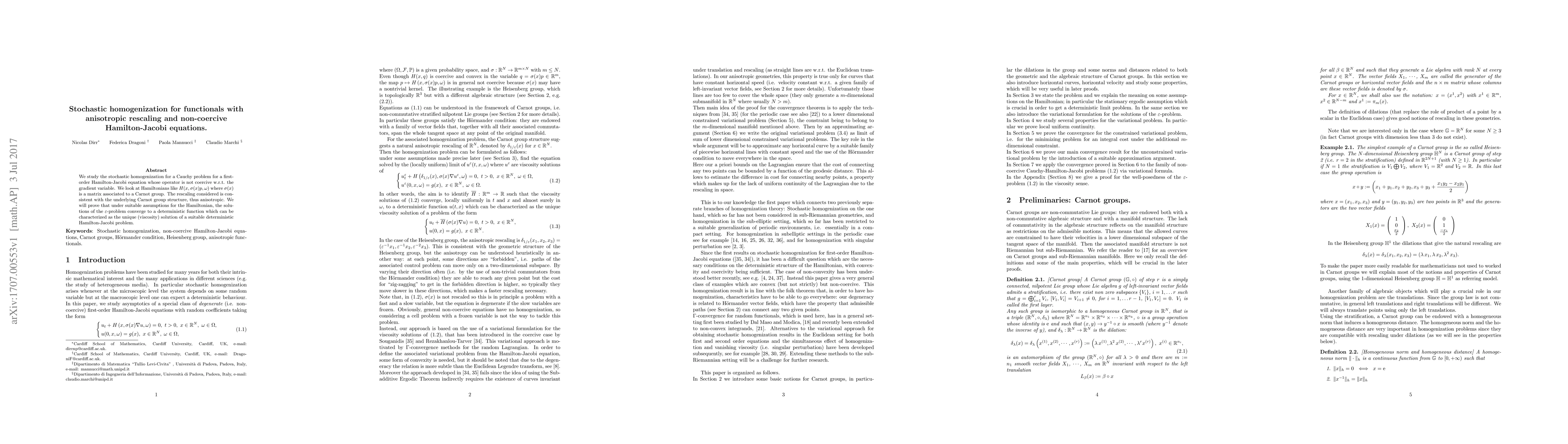 We study the stochastic homogenization for a Cauchy problem for a first-order Hamilton-Jacobi equation whose operator is not coercive w.r.t. the gradient variable. We look at Hamiltonians like $H(x,\sigma(x)p,\omega)$ where $\sigma(x)$ is a matrix associated to a Carnot group. The rescaling considered is consistent with the underlying Carnot group structure, thus anisotropic. We will prove that under suitable assumptions for the Hamiltonian, the solutions of the $\varepsilon$-problem converge to a deterministic function which can be characterized as the unique (viscosity) solution of a suitable deterministic Hamilton-Jacobi problem.