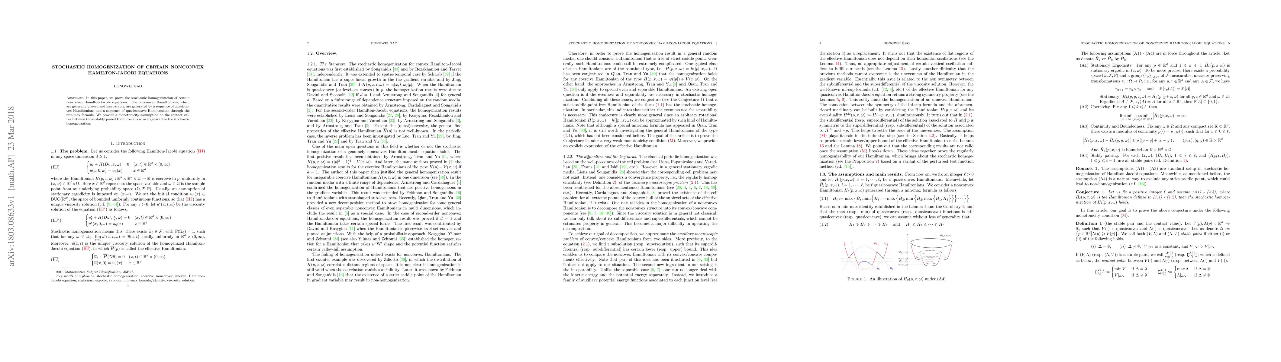 The paper proves stochastic homogenization of certain nonconvex Hamilton-Jacobi equations by establishing a monotonicity assumption on contact values between paired quasiconvex and quasiconcave Hamiltonians via a min-max formula.
