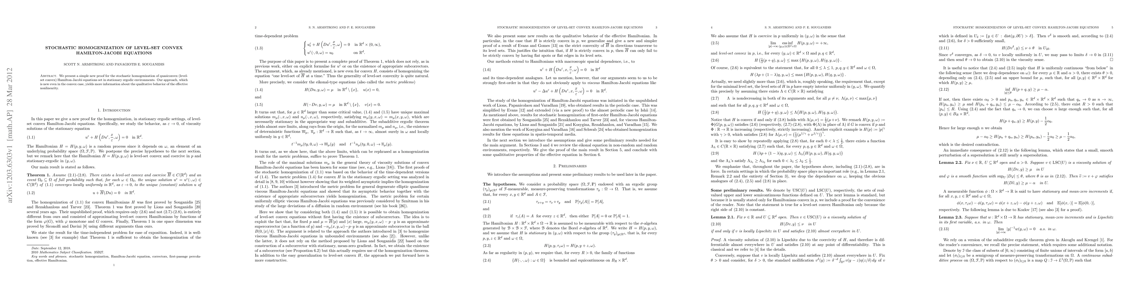 We present a simple new proof for the stochastic homogenization of quasiconvex (level-set convex) Hamilton-Jacobi equations set in stationary ergodic environments. Our approach, which is new even in the convex case, yields more information about the qualitative behavior of the effective nonlinearity.