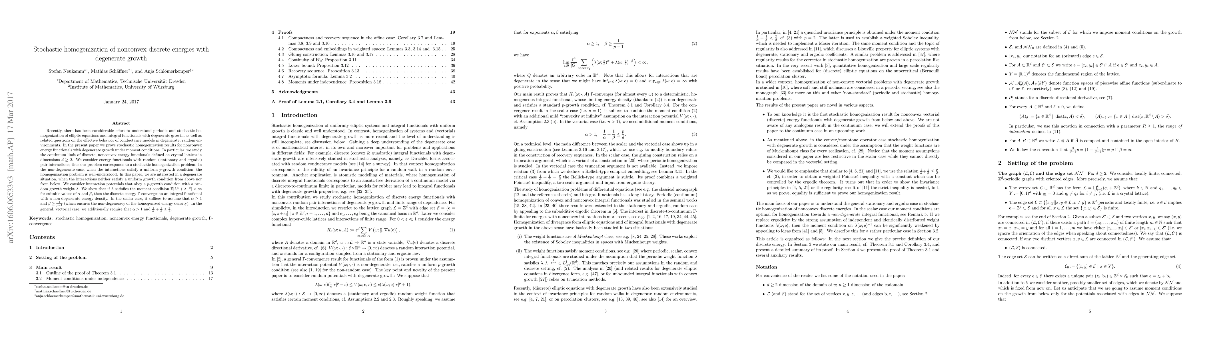 This paper investigates the continuum limit of discrete, nonconvex energy functionals on crystal lattices, focusing on stochastic homogenization problems with random interactions. It demonstrates that under certain moment conditions on the random growth weight, the discrete energy $\Gamma$-converges to an integral functional with a non-degenerate energy density, marking the first results of this kind for nonconvex energy functionals with degenerate growth.