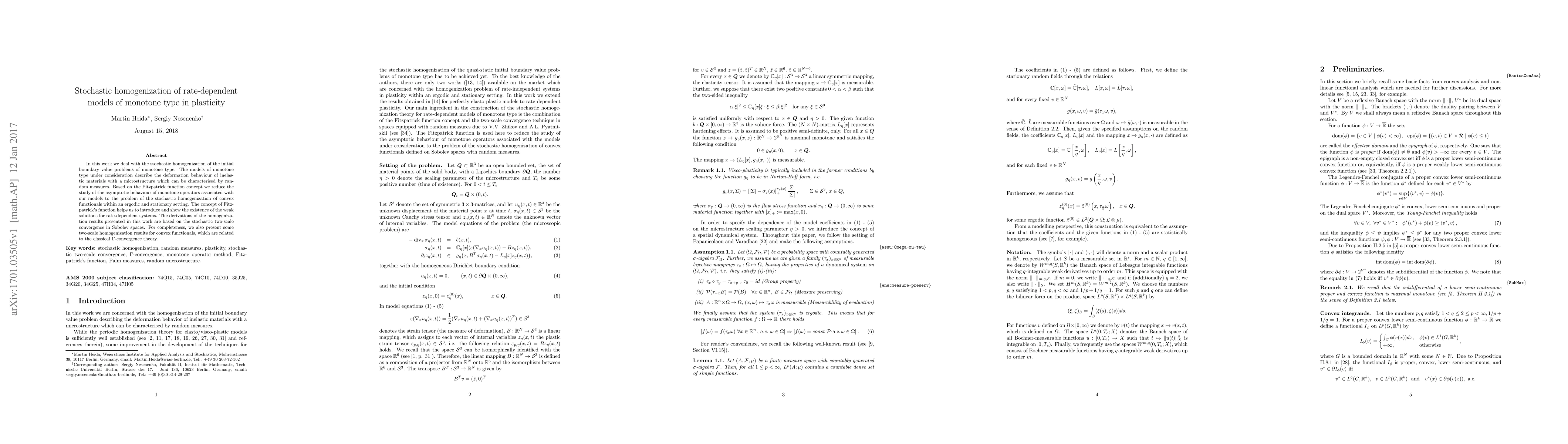 In this work we deal with the stochastic homogenization of the initial boundary value problems of monotone type. The models of monotone type under consideration describe the deformation behaviour of inelastic materials with a microstructure which can be characterised by random measures. Based on the Fitzpatrick function concept we reduce the study of the asymptotic behaviour of monotone operators associated with our models to the problem of the stochastic homogenization of convex functionals within an ergodic and stationary setting. The concept of Fitzpatrick's function helps us to introduce and show the existence of the weak solutions for rate-dependent systems. The derivations of the homogenization results presented in this work are based on the stochastic two-scale convergence in Sobolev spaces. For completeness, we also present some two-scale homogenization results for convex functionals, which are related to the classical $\Gamma$-convergence theory.