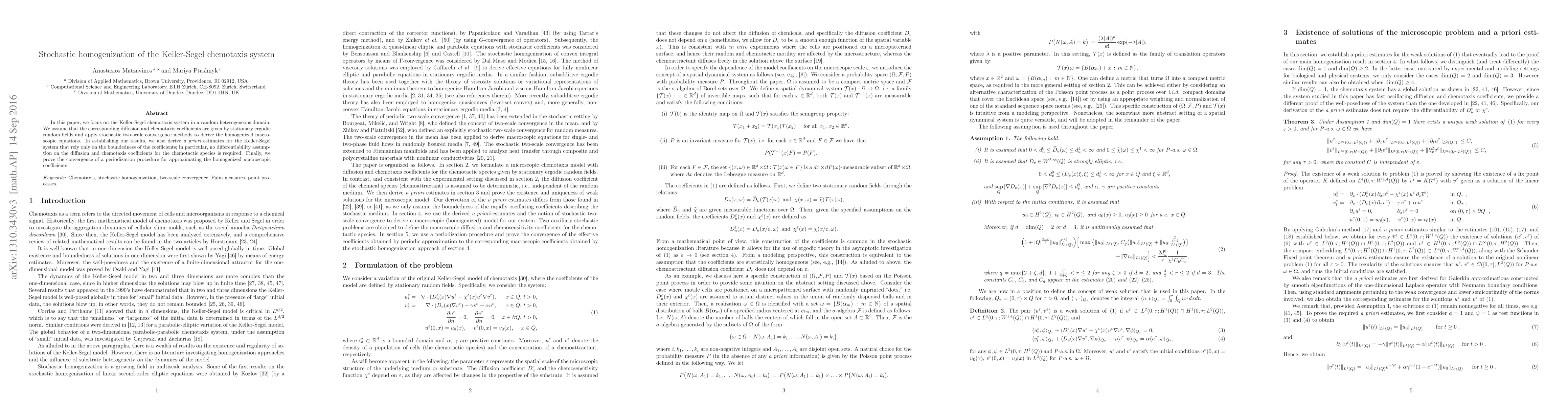 This paper investigates the Keller-Segel chemotaxis system within a random heterogeneous domain, deriving homogenized macroscopic equations using stochastic two-scale convergence methods. It also establishes a priori estimates for the system without requiring differentiability of the coefficients.