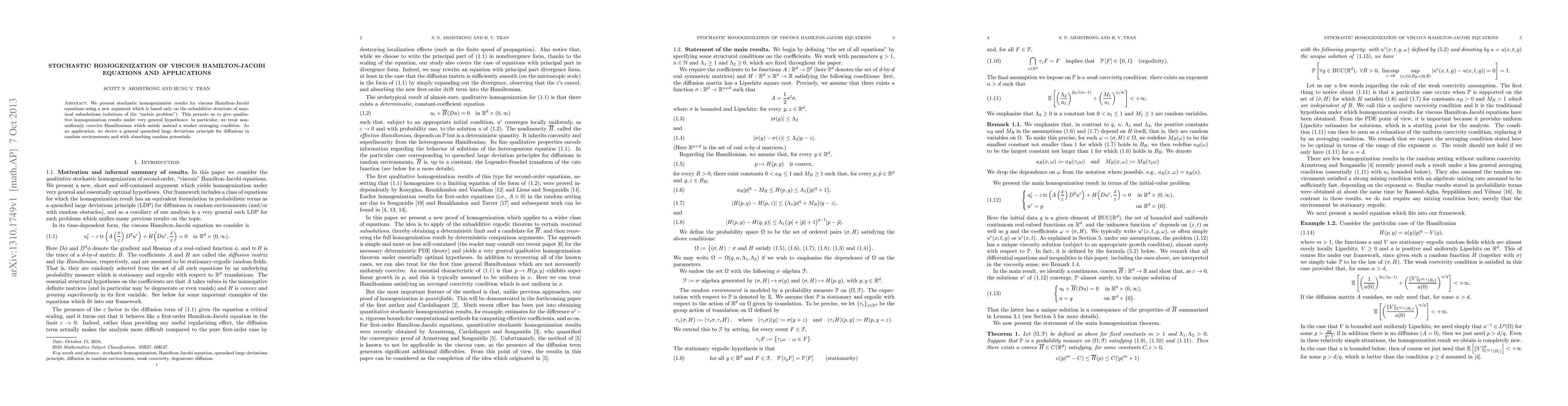 This paper develops stochastic homogenization techniques for viscous Hamilton-Jacobi equations under general conditions, focusing on non-uniformly coercive Hamiltonians. The results are applied to derive a quenched large deviations principle for diffusions in random environments.