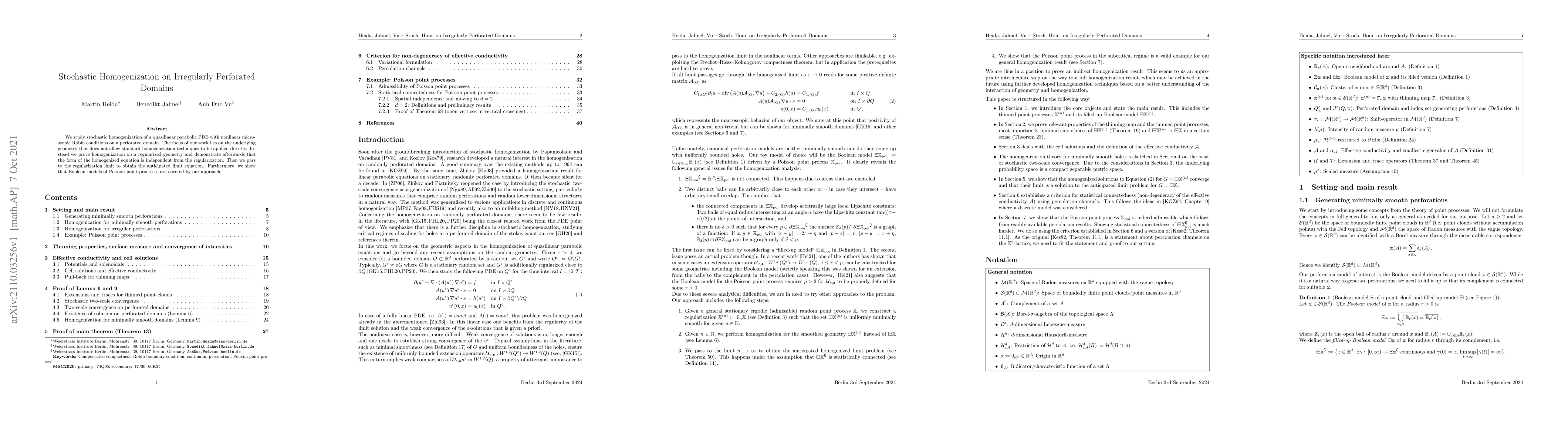 This paper investigates stochastic homogenization for a quasilinear parabolic PDE on irregularly perforated domains, proving homogenization on regularized geometries and showing that the homogenized equation remains consistent regardless of regularization. The method also applies to Boolean models generated by Poisson point processes.
