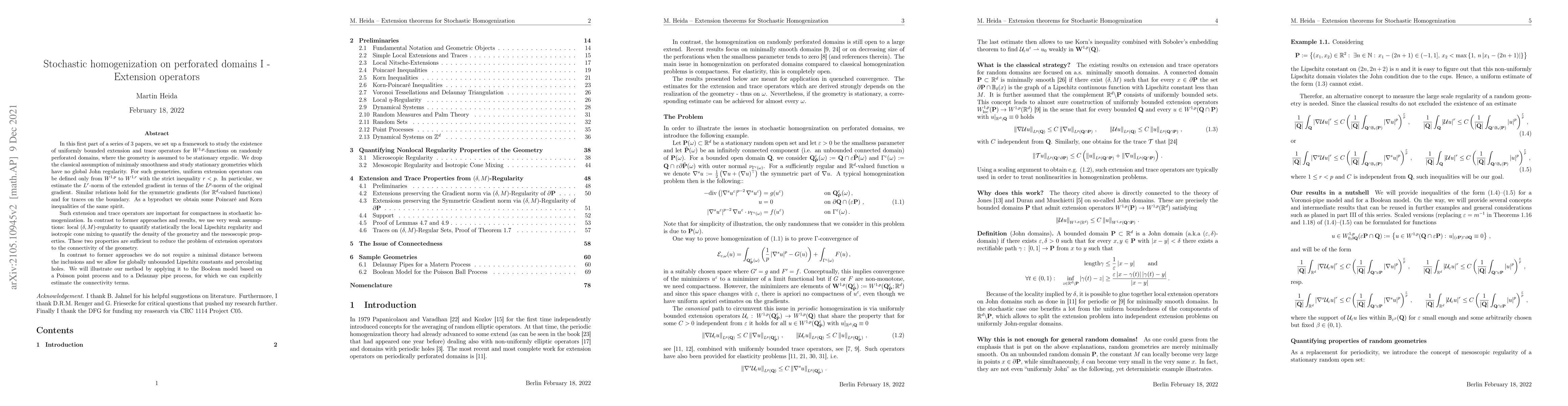 We study the existence of uniformly bounded extension and trace operators for W^{1,p}-functions on randomly perforated domains, where the geometry is assumed to be stationary ergodic. Such extension and trace operators are important for compactness in stochastic homogenization. In contrast to former approaches and results, we use very weak assumptions on the geometry which we call local (\delta,M)-regularity, isotropic cone mixing and bounded average connectivity. The first concept measures local Lipschitz regularity of the domain while the second measures the mesoscopic distribution of void space. The third is the most tricky part and measures the "mesoscopic" connectivity of the geometry. In contrast to former approaches we do not require a minimal distance between the inclusions and we allow for globally unbounded Lipschitz constants and percolating holes. We will illustrate our method by applying it to the Boolean model based on a Poisson point process and to a Delaunay pipe process. This is Part I of a series of 3 papers that will be uploaded during the next weeks. It is part of a major revision of the original ArXiv 2001.10373. The original work was corrected, improved and extended significantly. In particular, the theory is now able to also deal with extensions that preserve the norm of the symmetrized gradient.