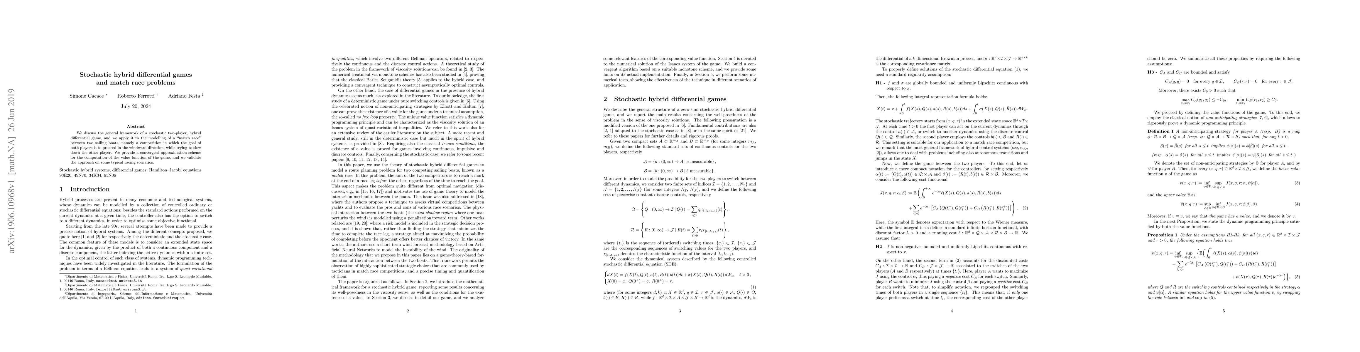 This paper develops a stochastic hybrid differential game framework to model "match race" sailing competitions, where two boats aim to move in the windward direction while attempting to hinder each other. It presents a convergent approximation scheme for computing the game's value function and validates the method through typical racing scenarios.