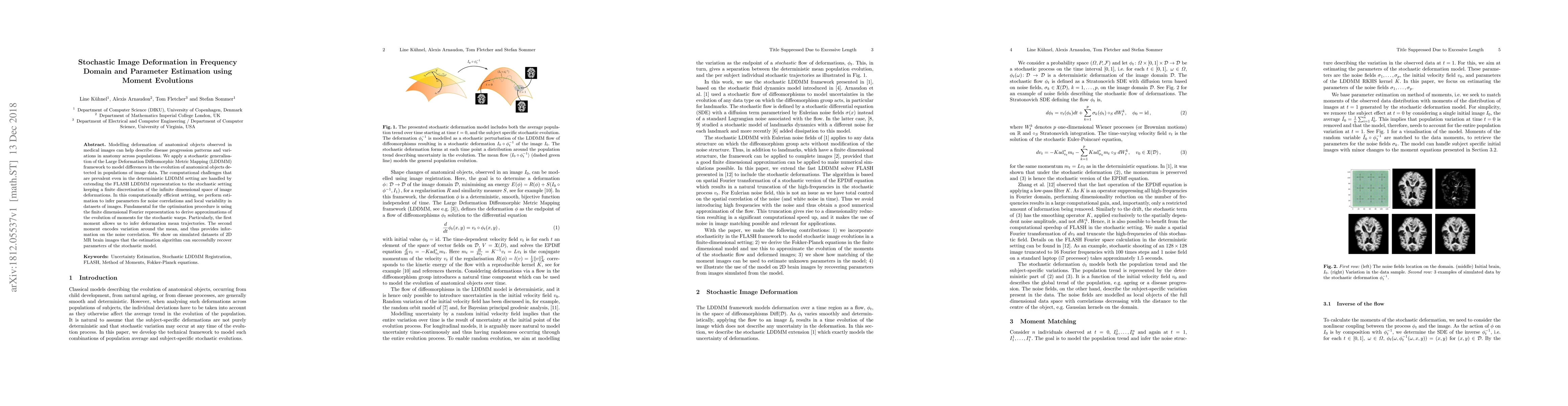 Modelling deformation of anatomical objects observed in medical images can help describe disease progression patterns and variations in anatomy across populations. We apply a stochastic generalisation of the Large Deformation Diffeomorphic Metric Mapping (LDDMM) framework to model differences in the evolution of anatomical objects detected in populations of image data. The computational challenges that are prevalent even in the deterministic LDDMM setting are handled by extending the FLASH LDDMM representation to the stochastic setting keeping a finite discretisation of the infinite dimensional space of image deformations. In this computationally efficient setting, we perform estimation to infer parameters for noise correlations and local variability in datasets of images. Fundamental for the optimisation procedure is using the finite dimensional Fourier representation to derive approximations of the evolution of moments for the stochastic warps. Particularly, the first moment allows us to infer deformation mean trajectories. The second moment encodes variation around the mean, and thus provides information on the noise correlation. We show on simulated datasets of 2D MR brain images that the estimation algorithm can successfully recover parameters of the stochastic model.