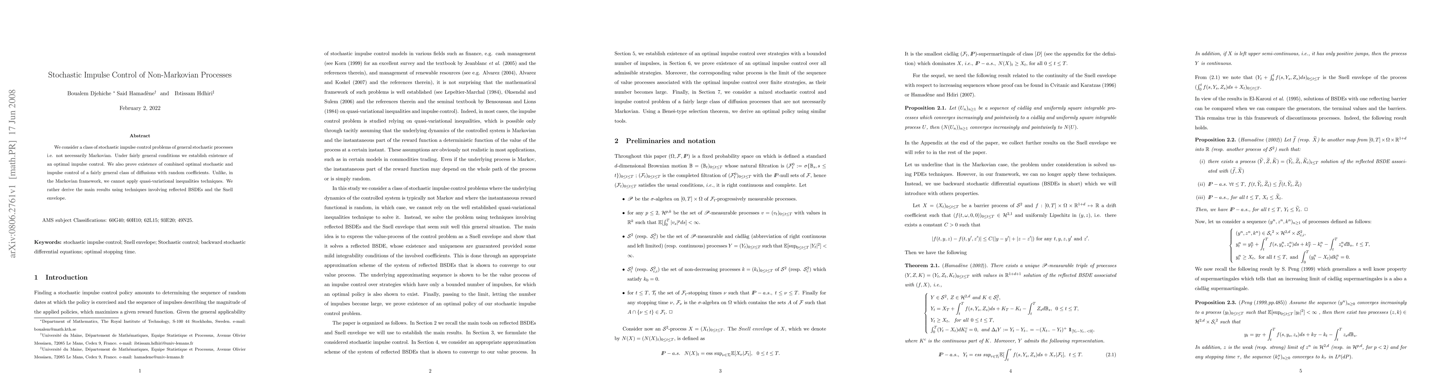This paper explores stochastic impulse control for non-Markovian processes, establishing the existence of optimal impulse control and combined optimal stochastic and impulse control for diffusions with random coefficients. The study employs reflected BSDEs and the Snell envelope, diverging from quasi-variational inequalities used in Markovian frameworks.