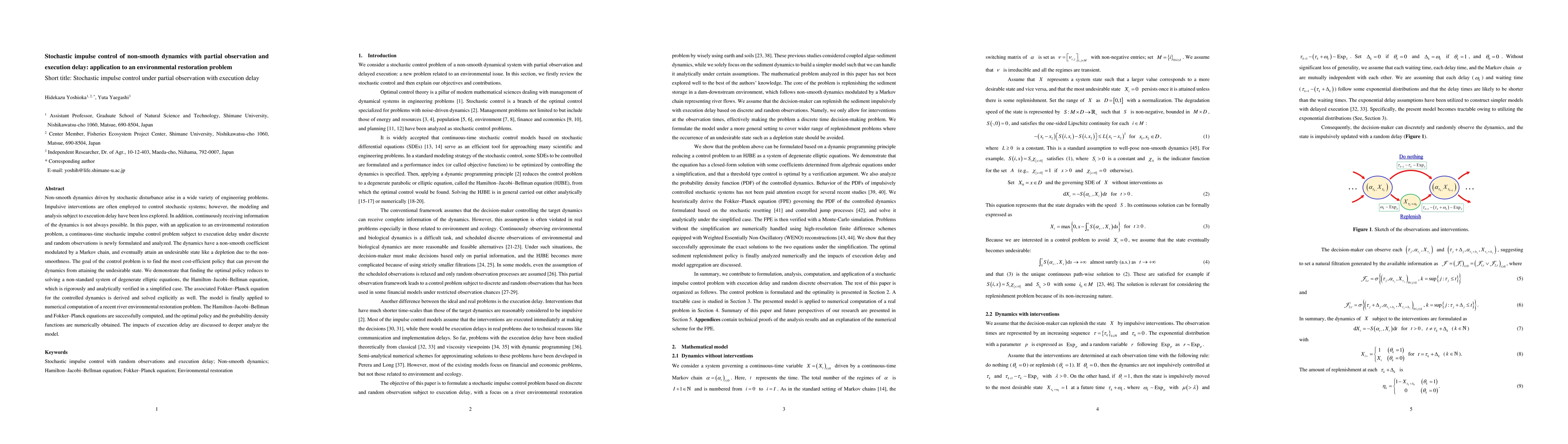 This paper formulates and analyzes a stochastic impulse control problem for non-smooth dynamics with partial observation and execution delay, applied to an environmental restoration scenario. The goal is to find a cost-efficient policy to prevent undesirable states, solved via a system of degenerate elliptic equations and the Fokker-Planck equation, with numerical results demonstrating the model's effectiveness.