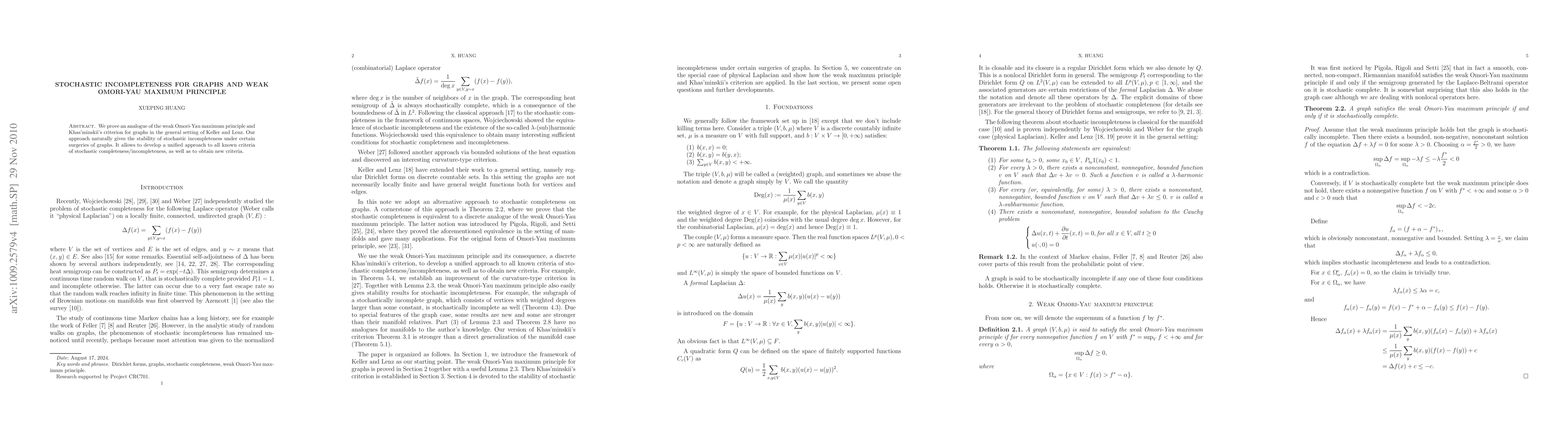 Researchers prove an analogue of a maximum principle for graphs, establishing stability under certain surgeries and unifying known criteria for stochastic completeness/incompleteness.