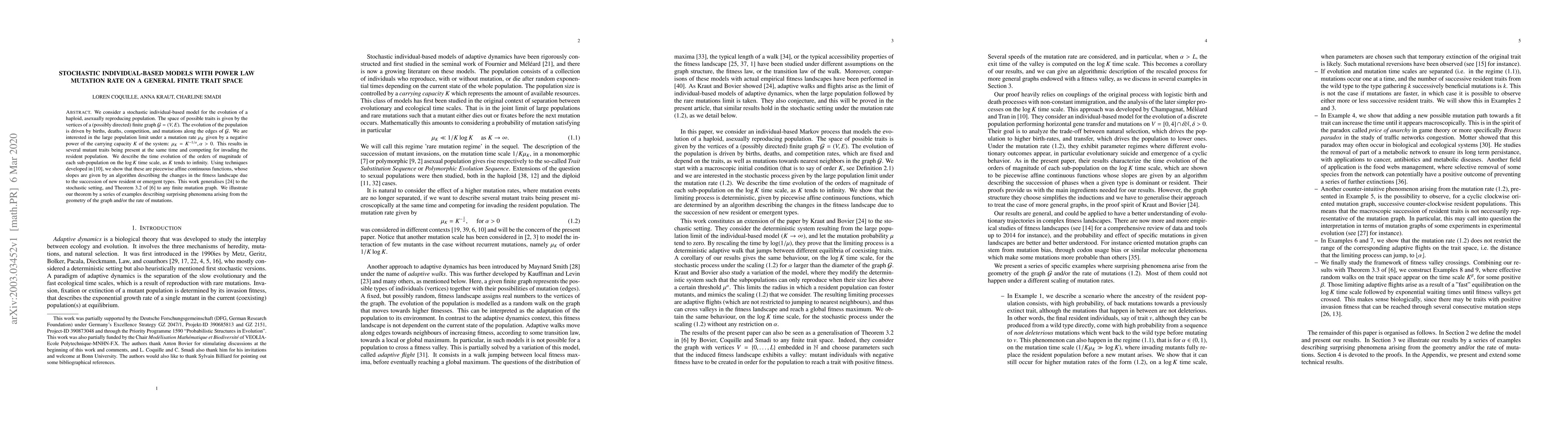 We consider a stochastic individual-based model for the evolution of a haploid, asexually reproducing population. The space of possible traits is given by the vertices of a (possibly directed) finite graph $G=(V,E)$. The evolution of the population is driven by births, deaths, competition, and mutations along the edges of $G$. We are interested in the large population limit under a mutation rate $\mu_K$ given by a negative power of the carrying capacity $K$ of the system: $\mu_K=K^{-1/\alpha},\alpha>0$. This results in several mutant traits being present at the same time and competing for invading the resident population. We describe the time evolution of the orders of magnitude of each sub-population on the $\log K$ time scale, as $K$ tends to infinity. Using techniques developed in [Champagnat, M\'el\'eard, Tran, 2019] we show that these are piecewise affine continuous functions, whose slopes are given by an algorithm describing the changes in the fitness landscape due to the succession of new resident or emergent types. This work generalises [Kraut, Bovier, 2019] to the stochastic setting, and Theorem 3.2 of [Bovier, Coquille, Smadi, 2018] to any finite mutation graph. We illustrate our theorem by a series of examples describing surprising phenomena arising from the geometry of the graph and/or the rate of mutations.