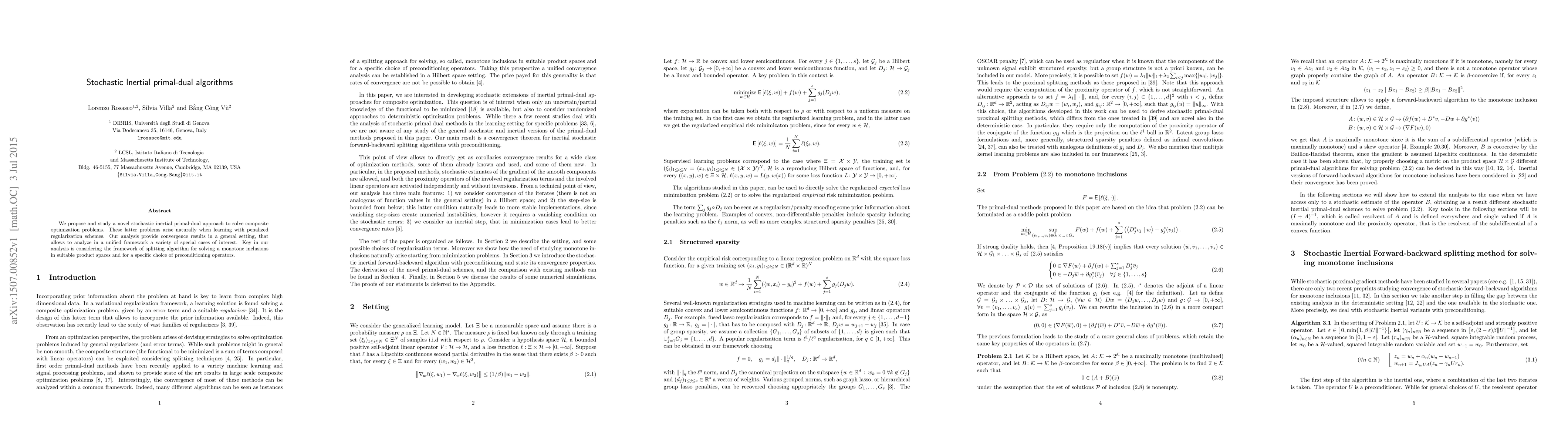 This paper introduces a novel stochastic inertial primal-dual algorithm for solving composite optimization problems, particularly those arising in penalized regularization schemes. The authors provide convergence analysis in a general setting, unifying various special cases and leveraging splitting algorithms for monotone inclusions.
