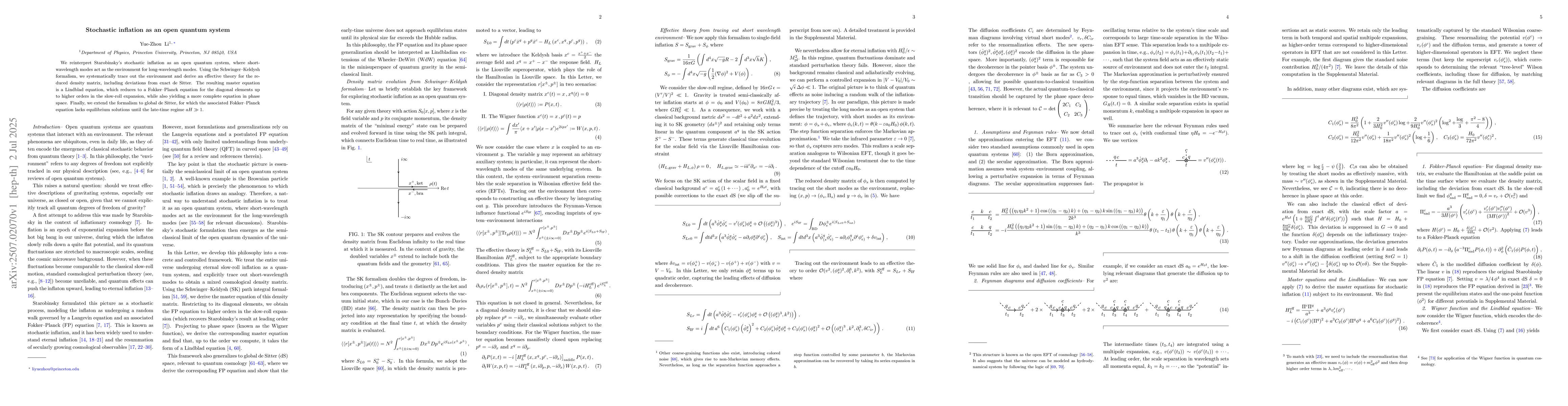 We reinterpret Starobinsky's stochastic inflation as an open quantum system, where short-wavelength modes act as the environment for long-wavelength modes. Using the Schwinger-Keldysh formalism, we systematically trace out the environment and derive an effective theory for the reduced density matrix, including deviations from exact de Sitter. The resulting master equation is a Lindblad equation, which reduces to a Fokker-Planck equation for the diagonal elements up to higher orders in the slow-roll expansion, while also yielding a more complete equation in phase space. Finally, we extend the formalism to global de Sitter, for which the associated Fokker-Planck equation lacks equilibrium solutions until the late-time regime $aH \gg 1$.