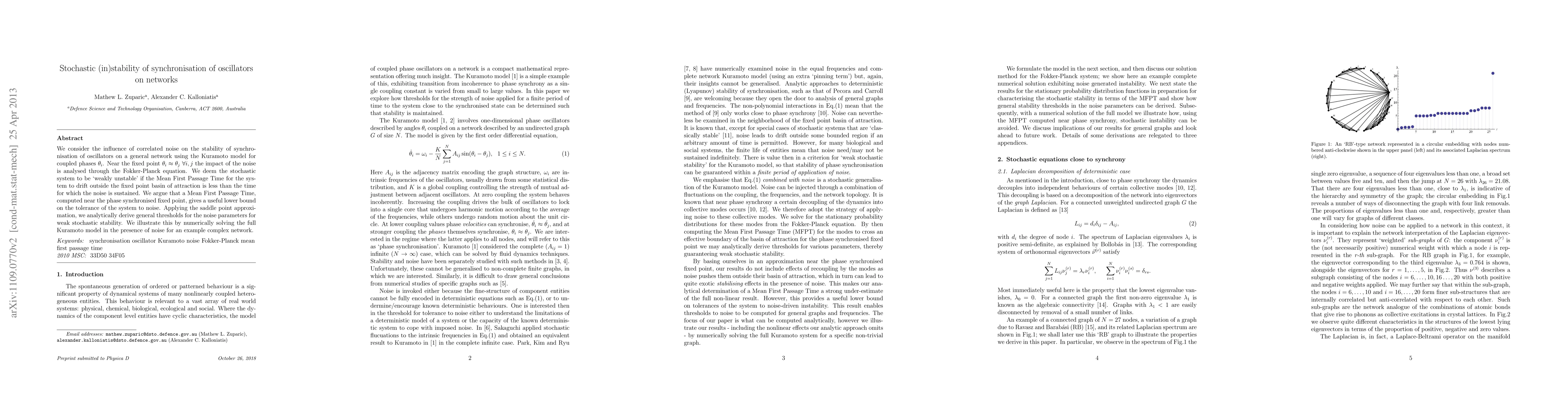 We consider the influence of correlated noise on the stability of synchronisation of oscillators on a general network using the Kuramoto model for coupled phases $\theta_i$. Near the fixed point $\theta_i \approx \theta_j \ \forall i,j$ the impact of the noise is analysed through the Fokker-Planck equation. We deem the stochastic system to be `weakly unstable' if the Mean First Passage Time for the system to drift outside the fixed point basin of attraction is less than the time for which the noise is sustained. We argue that a Mean First Passage Time, computed near the phase synchronised fixed point, gives a useful lower bound on the tolerance of the system to noise. Applying the saddle point approximation, we analytically derive general thresholds for the noise parameters for weak stochastic stability. We illustrate this by numerically solving the full Kuramoto model in the presence of noise for an example complex network.