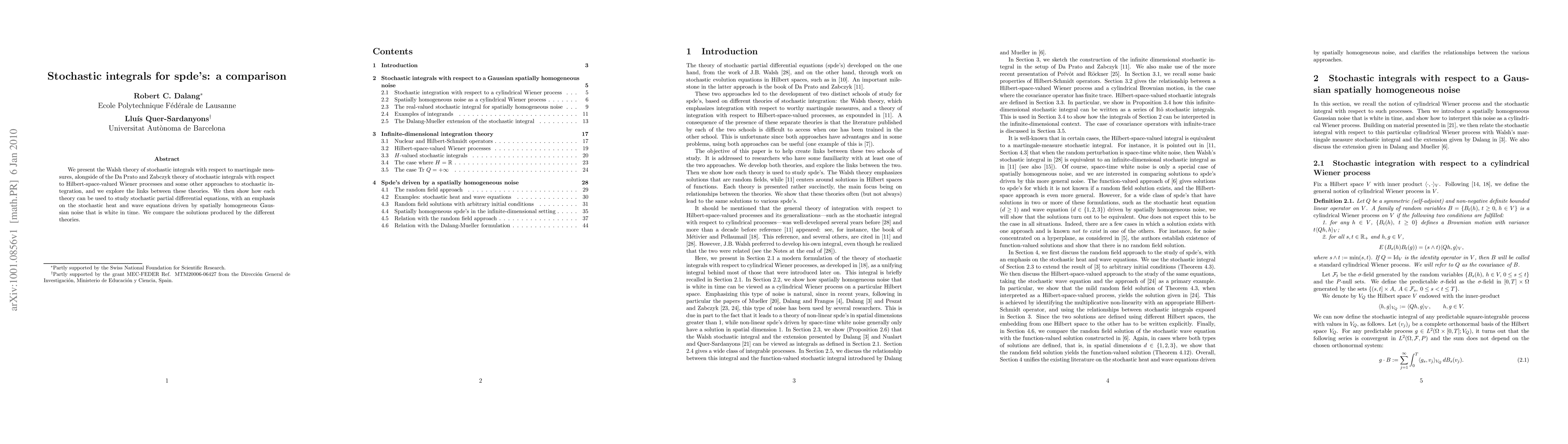 We present the Walsh theory of stochastic integrals with respect to martingale measures, alongside of the Da Prato and Zabczyk theory of stochastic integrals with respect to Hilbert-space-valued Wiener processes and some other approaches to stochastic integration, and we explore the links between these theories. We then show how each theory can be used to study stochastic partial differential equations, with an emphasis on the stochastic heat and wave equations driven by spatially homogeneous Gaussian noise that is white in time. We compare the solutions produced by the different theories.