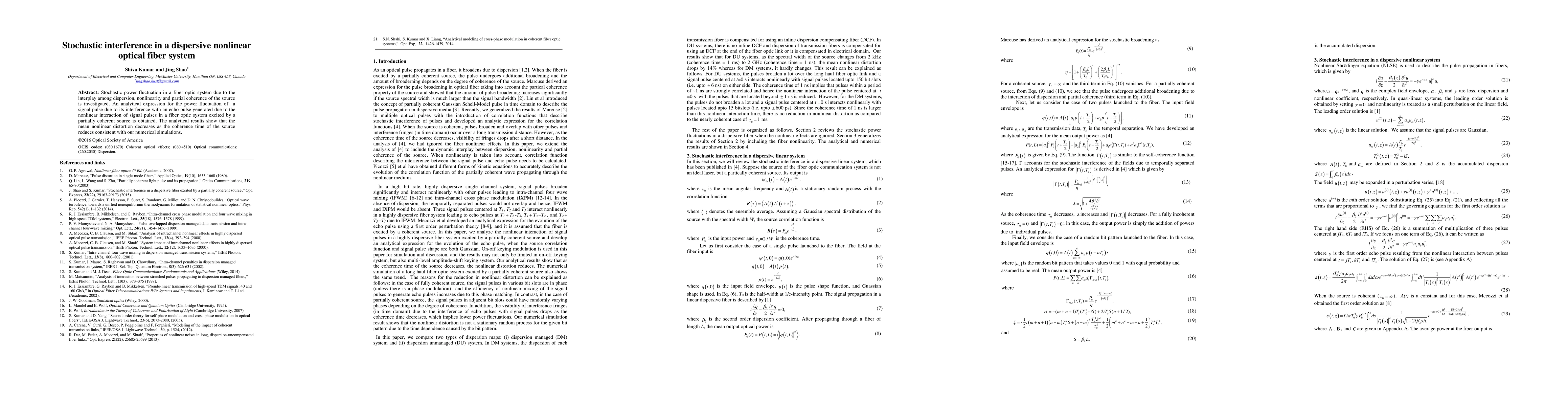 A study investigates how stochastic power fluctuations in fiber optic systems occur due to dispersion, nonlinearity, and source coherence, finding that reduced source coherence leads to decreased nonlinear distortion.