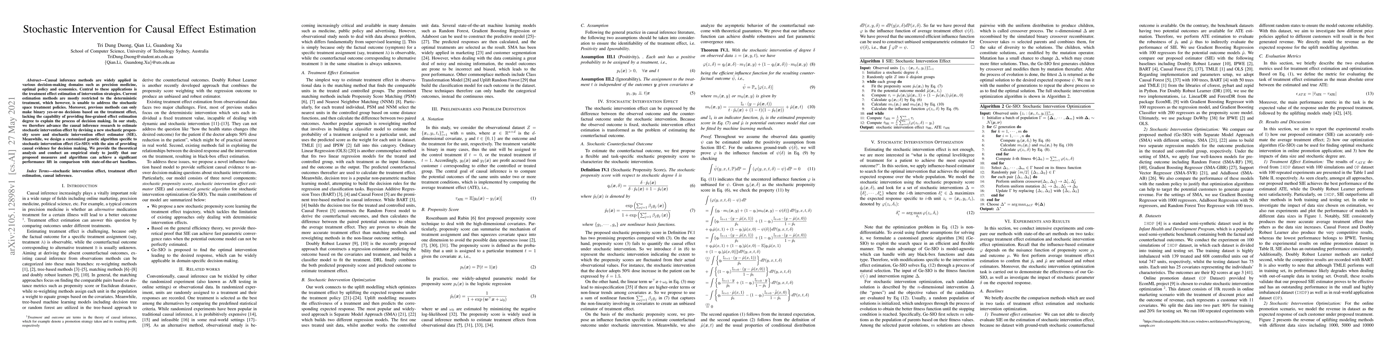 This paper introduces a novel stochastic propensity score and stochastic intervention effect estimator (SIE) to estimate the effects of stochastic intervention strategies, addressing limitations of current deterministic methods. It also proposes a genetic algorithm (Ge-SIO) tailored for stochastic interventions, demonstrating significant performance improvements over existing approaches through theoretical analysis and empirical study.