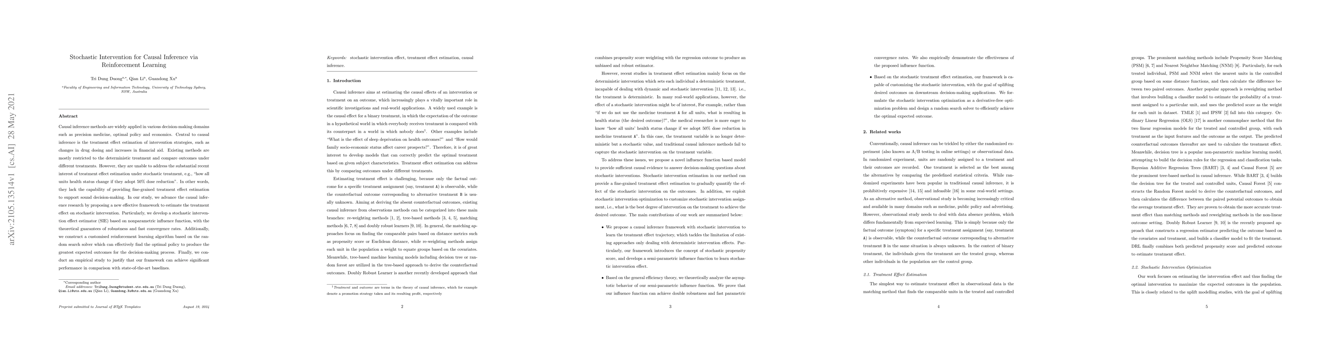 This paper proposes a novel framework for estimating treatment effects under stochastic interventions using reinforcement learning. The developed stochastic intervention effect estimator (SIE) ensures robustness and fast convergence, while a custom reinforcement learning algorithm optimizes decision-making policies. Empirical results demonstrate superior performance compared to existing methods.
