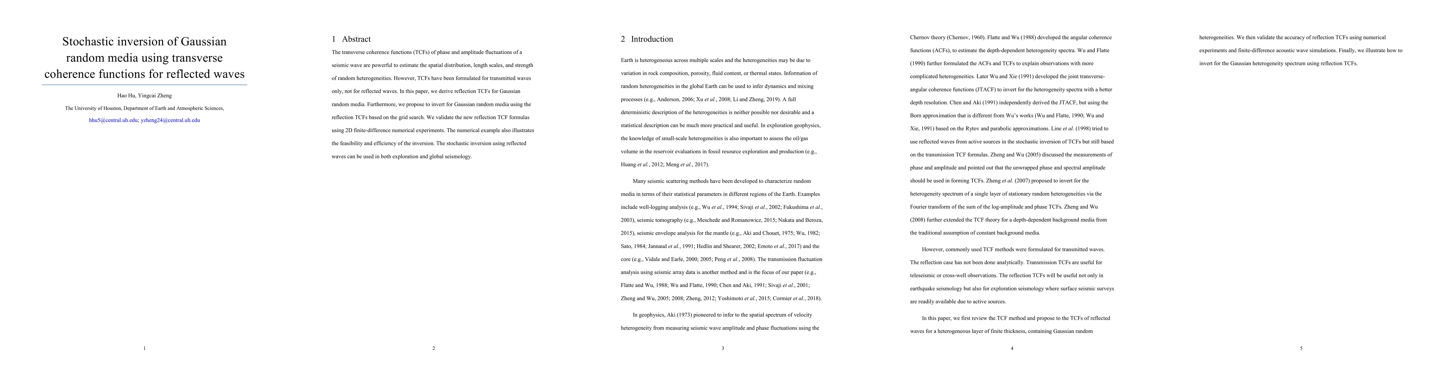 This paper develops reflection transverse coherence functions (TCFs) for Gaussian random media to estimate spatial distributions and heterogeneities from reflected seismic waves. It proposes a grid search inversion method using these TCFs, validated through 2D finite-difference simulations, demonstrating the method's feasibility and efficiency for applications in exploration and global seismology.