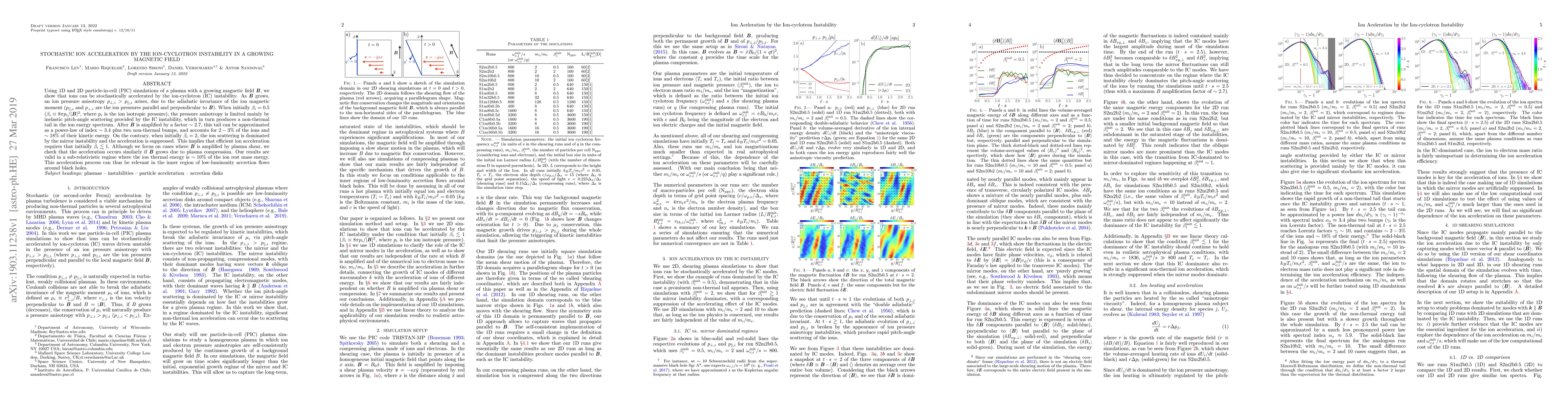 This paper demonstrates stochastic ion acceleration via the ion-cyclotron instability in growing magnetic fields using PIC simulations. The study finds that when the magnetic field amplifies, ions experience pressure anisotropy and are accelerated non-thermally, forming a power-law tail in the energy spectrum, especially when initial $\beta_i \lesssim 1$. The process is relevant in sub-relativistic regimes and may apply to accretion flows around black holes.