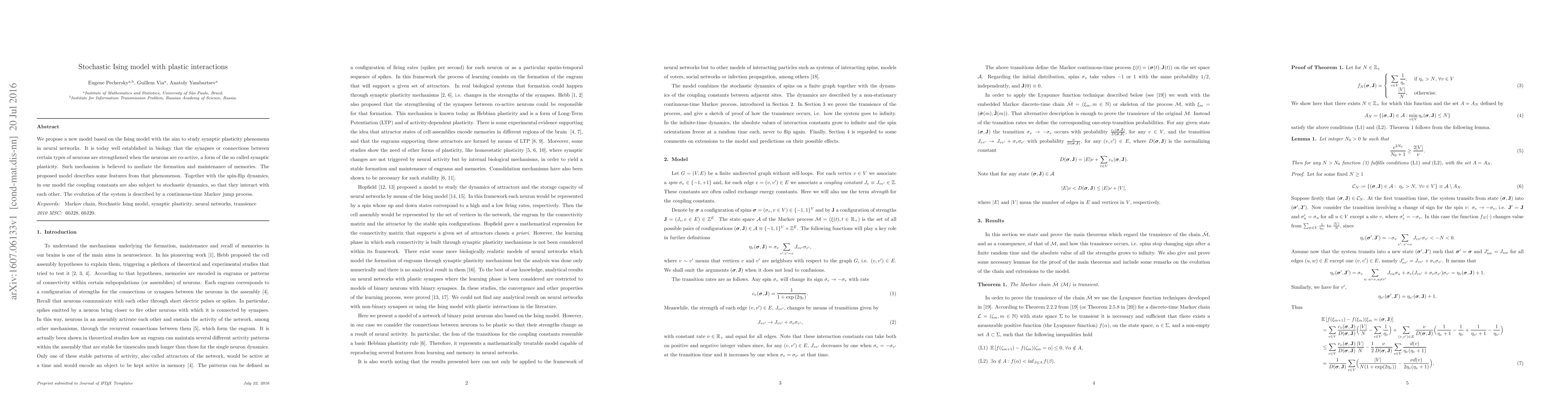 We propose a new model based on the Ising model with the aim to study synaptic plasticity phenomena in neural networks. It is today well established in biology that the synapses or connections between certain types of neurons are strengthened when the neurons are co-active, a form of the so called synaptic plasticity. Such mechanism is believed to mediate the formation and maintenance of memories. The proposed model describes some features from that phenomenon. Together with the spin-flip dynamics, in our model the coupling constants are also subject to stochastic dynamics, so that they interact with each other. The evolution of the system is described by a continuous-time Markov jump process. Keyword Markov chain, Stochastic Ising model, synaptic plasticity, neural networks, transience