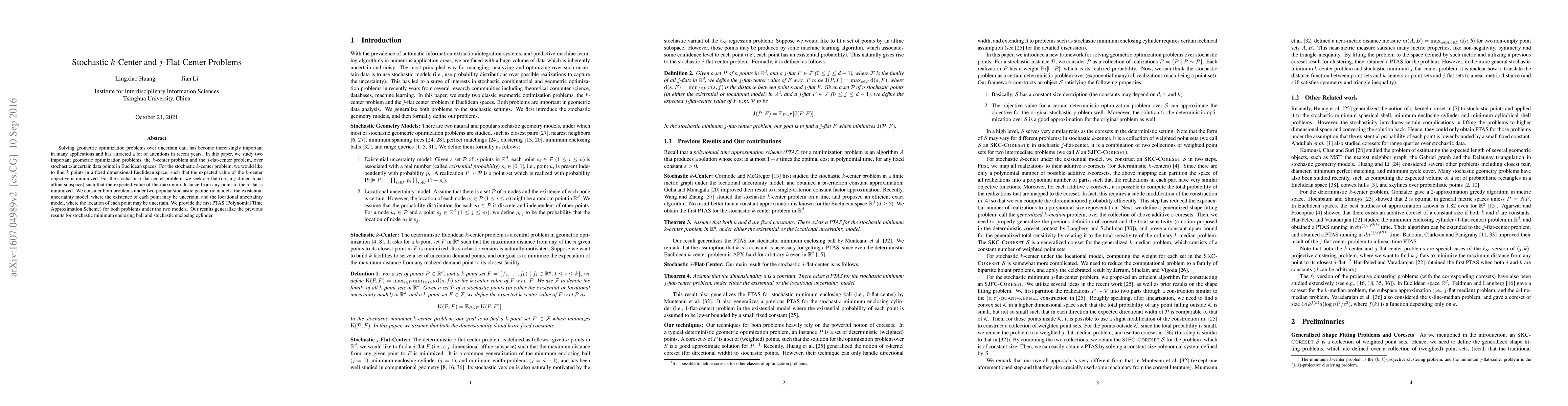 Researchers develop a Polynomial Time Approximation Scheme (PTAS) for two geometric optimization problems that solve over uncertain data points in Euclidean spaces, improving upon previous results with generalizability to other stochastic models.
