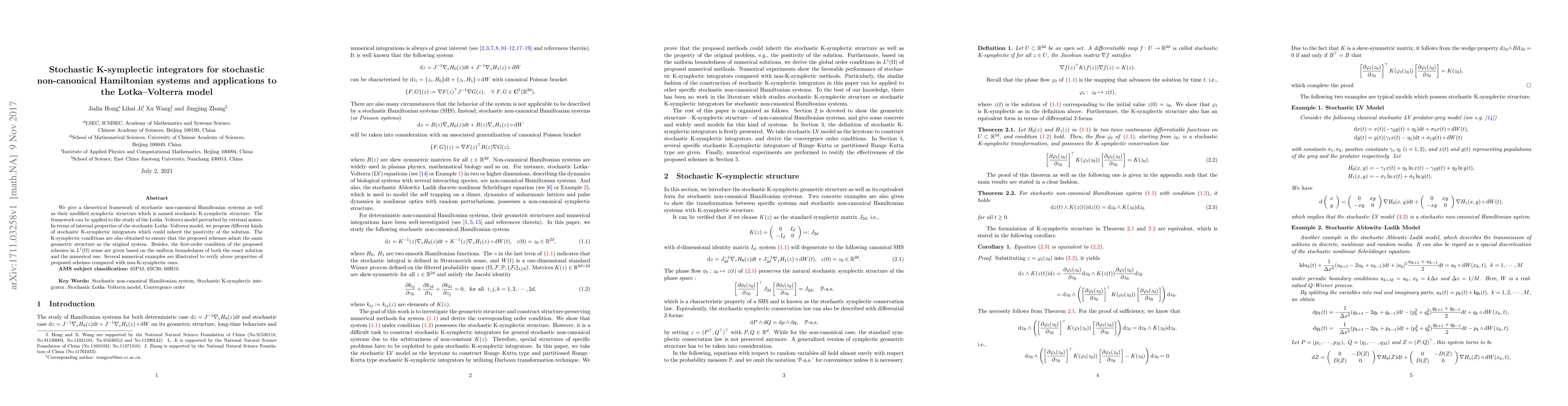 We give a theoretical framework of stochastic non-canonical Hamiltonian systems as well as their modified symplectic structure which is named stochastic K-symplectic structure. The framework can be applied to the study of the Lotka--Volterra model perturbed by external noises. In terms of internal properties of the stochastic Lotka--Volterra model, we propose different kinds of stochastic K-symplectic integrators which could inherit the positivity of the solution. The K-symplectic conditions are also obtained to ensure that the proposed schemes admit the same geometric structure as the original system. Besides, the first-order condition of the proposed schemes in $L^1(\Omega)$ sense are given based on the uniform boundedness of both the exact solution and the numerical one. Several numerical examples are illustrated to verify above properties of proposed schemes compared with non-K-symplectic ones.