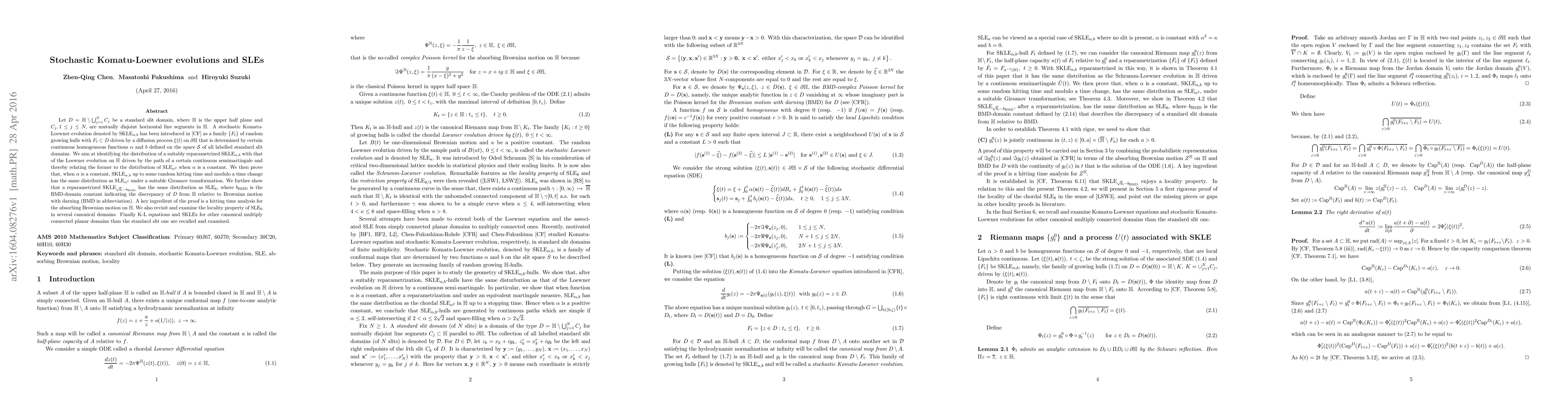 Let $D={\mathbb H}\setminus \bigcup_{j=1}^N C_j$ be a standard slit domain, where ${\mathbb H}$ is the upper half plane and $C_j,1\le j\le N,$ are mutually disjoint horizontal line segments in ${\mathbb H}$. A stochastic Komatu-Loewner evolution denoted by ${\rm SKLE}_{\alpha,b}$ has been introduced in \cite{CF} as a family $\{F_t\}$ of random growing hulls with $F_t\subset D$ driven by a diffusion process $\xi(t)$ on $\partial {\mathbb H}$ that is determined by certain continuous homogeneous functions $\alpha$ and $b$ defined on the space ${\cal S}$ of all labelled standard slit domains. We aim at identifying the distribution of a suitably reparametrized ${\rm SKLE}_{\alpha,b}$ with that of the Loewner evolution on ${\mathbb H}$ driven by the path of a certain continuous semimartingale and thereby relating the former to the distribution of ${\rm SLE}_{\alpha^2}$ when $\alpha$ is a constant. We then prove that, when $\alpha$ is a constant, ${\rm SKLE}_{\alpha,b}$ up to some random hitting time and modulo a time change has the same distribution as ${\rm SLE}_{\alpha^2}$ under a suitable Girsanov transformation. We further show that a reparametrized ${\rm SKLE}_{\sqrt{6},-b_{\rm BMD}}$ has the same distribution as ${\rm SLE}_6$, where $b_{\rm BMD}$ is the BMD-domain constant indicating the discrepancy of $D$ from ${\mathbb H}$ relative to Brownian motion with darning (BMD in abbreviation). A key ingredient of the proof is a hitting time analysis for the absorbing Brownian motion on ${\mathbb H}.$ We also revisit and examine the locality property of ${\rm SLE}_6$ in several canonical domains. Finally K-L equations and SKLEs for other canonical multiply connected planar domains than the standard slit one are recalled and examined.