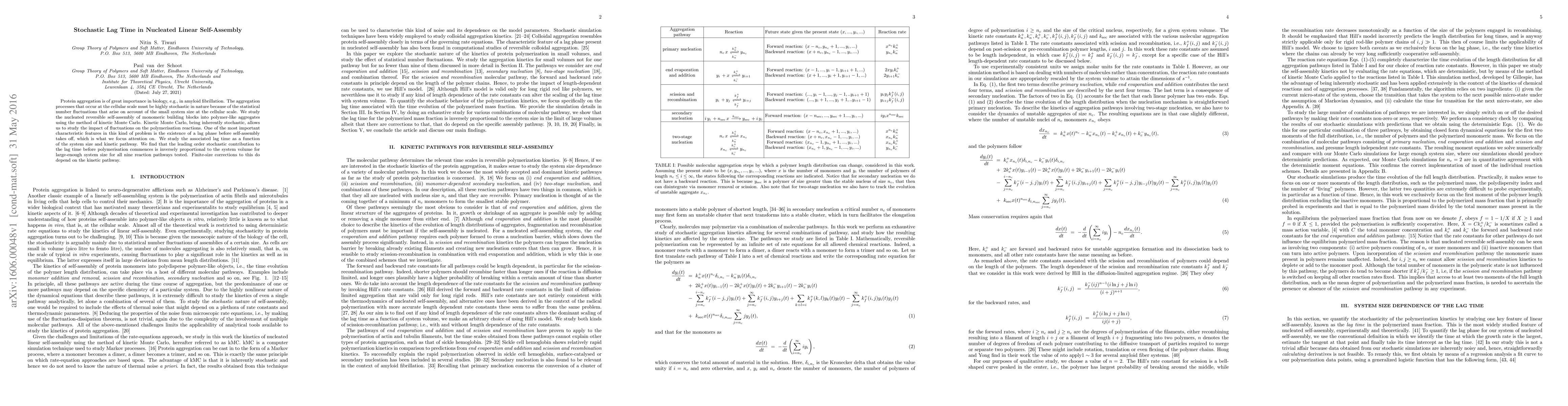 This paper investigates the stochastic lag time in nucleated linear self-assembly processes, using kinetic Monte Carlo to model protein aggregation. It finds that the lag time before polymerization inversely correlates with system volume for large systems, with finite-size corrections varying by kinetic pathway.