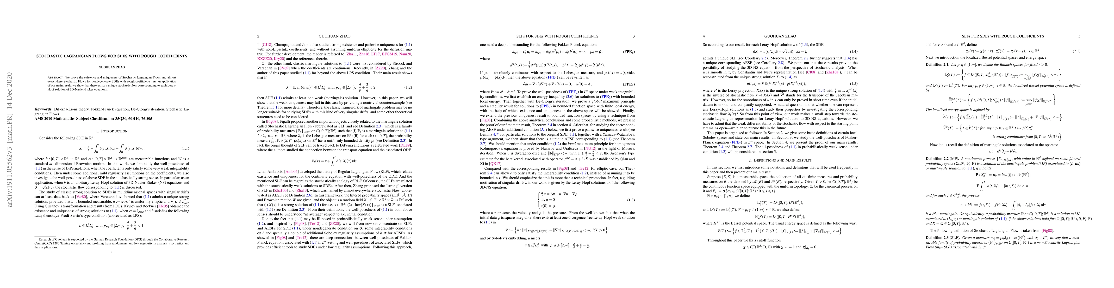 This paper establishes the existence and uniqueness of Stochastic Lagrangian Flows for stochastic differential equations with rough coefficients. It further demonstrates a unique Stochastic Flow for each Leray-Hopf solution of the 3D Navier-Stokes equation.