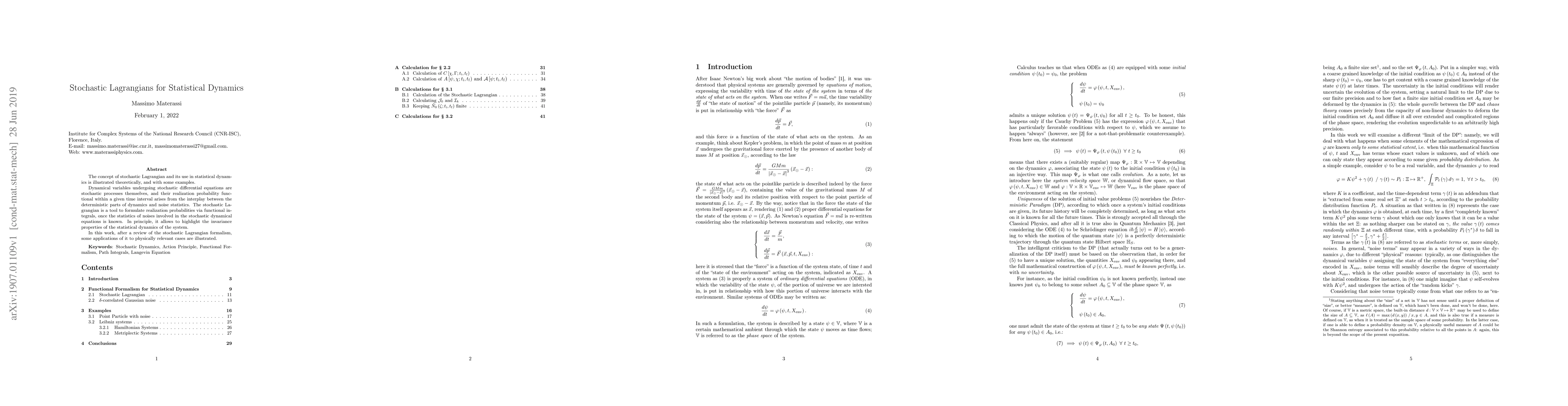 The concept of stochastic Lagrangian and its use in statistical dynamics is illustrated theoretically, and with some examples. Dynamical variables undergoing stochastic differential equations are stochastic processes themselves, and their realization probability functional within a given time interval arises from the interplay between the deterministic parts of dynamics and noise statistics. The stochastic Lagrangian is a tool to formulate realization probabilities via functional integrals, once the statistics of noises involved in the stochastic dynamical equations is known. In principle, it allows to highlight the invariance properties of the statistical dynamics of the system. In this work, after a review of the stochastic Lagrangian formalism, some applications of it to physically relevant cases are illustrated.