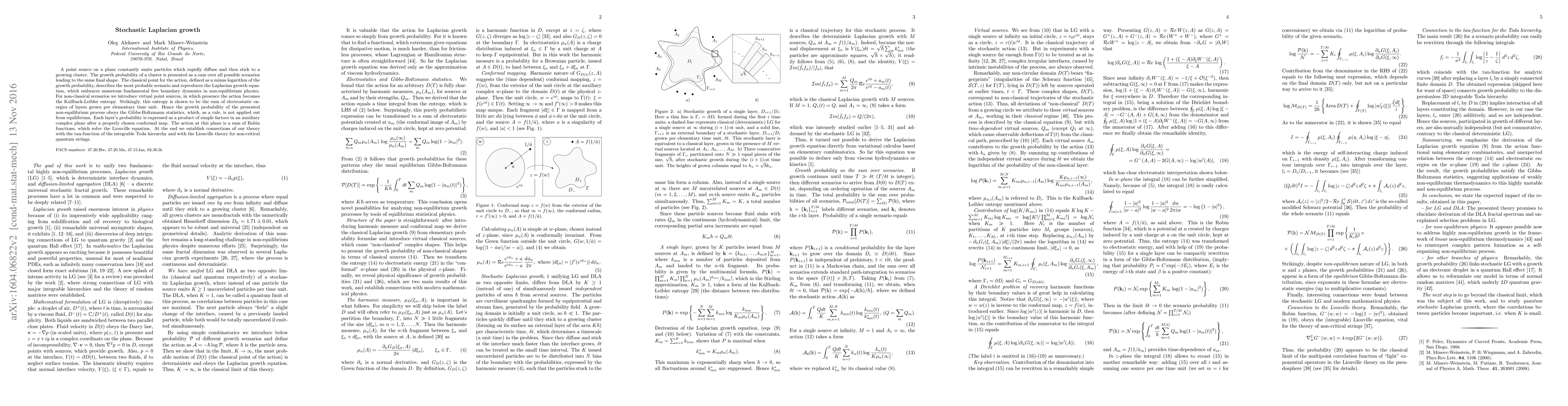 A point source on a plane constantly emits particles which rapidly diffuse and then stick to a growing cluster. The growth probability of a cluster is presented as a sum over all possible scenarios leading to the same final shape. The classical point for the action, defined as a minus logarithm of the growth probability, describes the most probable scenario and reproduces the Laplacian growth equation, which embraces numerous fundamental free boundary dynamics in non-equilibrium physics. For non-classical scenarios we introduce virtual point sources, in which presence the action becomes the Kullback-Leibler entropy. Strikingly, this entropy is shown to be the sum of electrostatic energies of layers grown per elementary time unit. Hence the growth probability of the presented non-equilibrium process obeys the Gibbs-Boltzmann statistics, which, as a rule, is not applied out from equilibrium. Each layer's probability is expressed as a product of simple factors in an auxiliary complex plane after a properly chosen conformal map. The action at this plane is a sum of Robin functions, which solve the Liouville equation. At the end we establish connections of our theory with the tau-function of the integrable Toda hierarchy and with the Liouville theory for non-critical quantum strings.