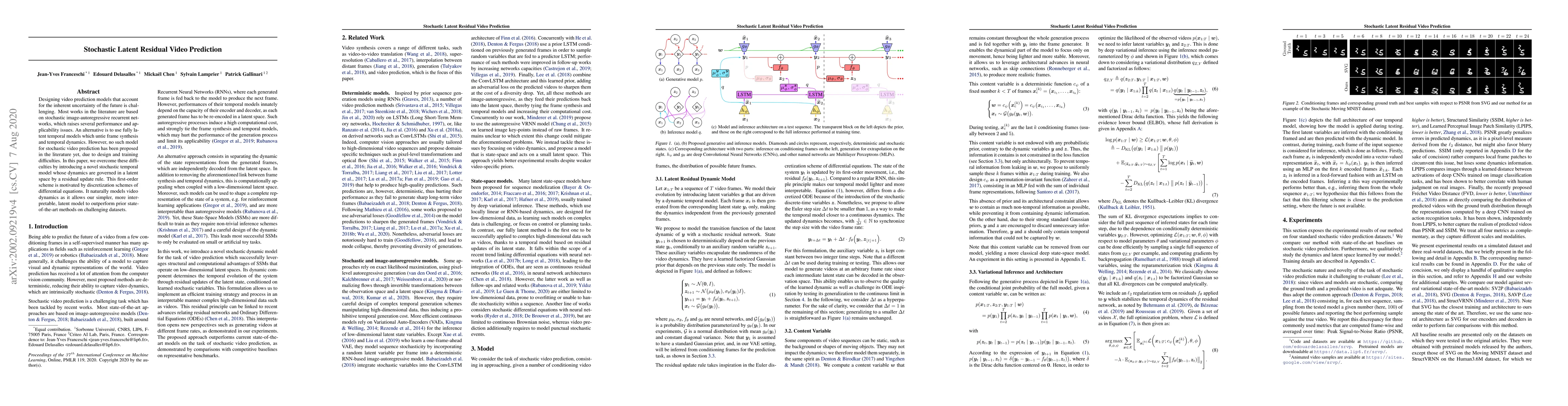 Designing video prediction models that account for the inherent uncertainty of the future is challenging. Most works in the literature are based on stochastic image-autoregressive recurrent networks, which raises several performance and applicability issues. An alternative is to use fully latent temporal models which untie frame synthesis and temporal dynamics. However, no such model for stochastic video prediction has been proposed in the literature yet, due to design and training difficulties. In this paper, we overcome these difficulties by introducing a novel stochastic temporal model whose dynamics are governed in a latent space by a residual update rule. This first-order scheme is motivated by discretization schemes of differential equations. It naturally models video dynamics as it allows our simpler, more interpretable, latent model to outperform prior state-of-the-art methods on challenging datasets.