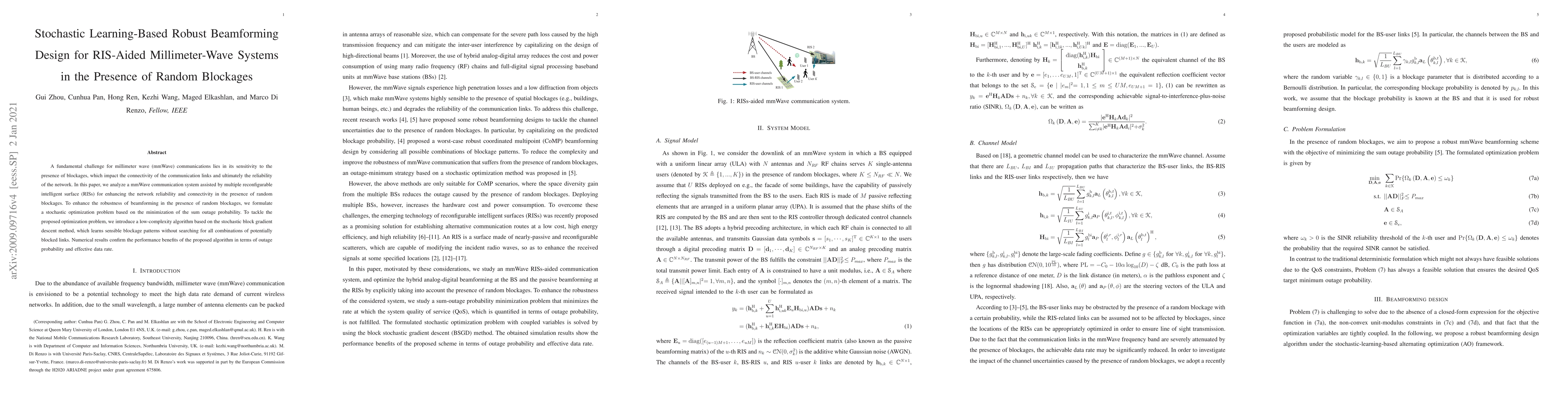 A fundamental challenge for millimeter wave (mmWave) communications lies in its sensitivity to the presence of blockages, which impact the connectivity of the communication links and ultimately the reliability of the entire network. In this paper, we analyze a reconfigurable intelligent surface (RIS)-aided mmWave communication system for enhancing the network reliability and connectivity in the presence of random blockages. To enhance the robustness of hybrid analog-digital beamforming in the presence of random blockages, we formulate a stochastic optimization problem based on the minimization of the sum outage probability. To tackle the proposed optimization problem, we introduce a low-complexity algorithm based on the stochastic block gradient descent method, which learns sensible blockage patterns without searching for all combinations of potentially blocked links. Numerical results confirm the performance benefits of the proposed algorithm in terms of outage probability and effective data rate.