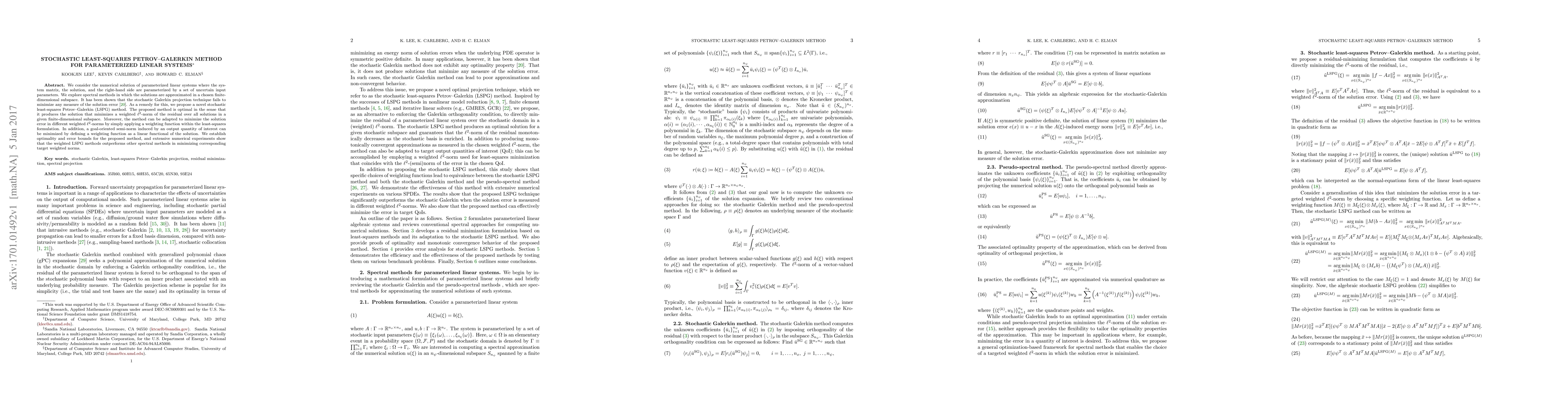 We consider the numerical solution of parameterized linear systems where the system matrix, the solution, and the right-hand side are parameterized by a set of uncertain input parameters. We explore spectral methods in which the solutions are approximated in a chosen finite-dimensional subspace. It has been shown that the stochastic Galerkin projection technique fails to minimize any measure of the solution error [20]. As a remedy for this, we propose a novel stochastic least-squares Petrov--Galerkin (LSPG) method. The proposed method is optimal in the sense that it produces the solution that minimizes a weighted l2-norm of the residual over all solutions in a given finite-dimensional subspace. Moreover, the method can be adapted to minimize the solution error in different weighted l2-norms by simply applying a weighting function within the least-squares formulation. In addition, a goal-oriented semi-norm induced by an output quantity of interest can be minimized by defining a weighting function as a linear functional of the solution. We establish optimality and error bounds for the proposed method, and extensive numerical experiments show that the weighted LSPG methods outperforms other spectral methods in minimizing corresponding target weighted norms.