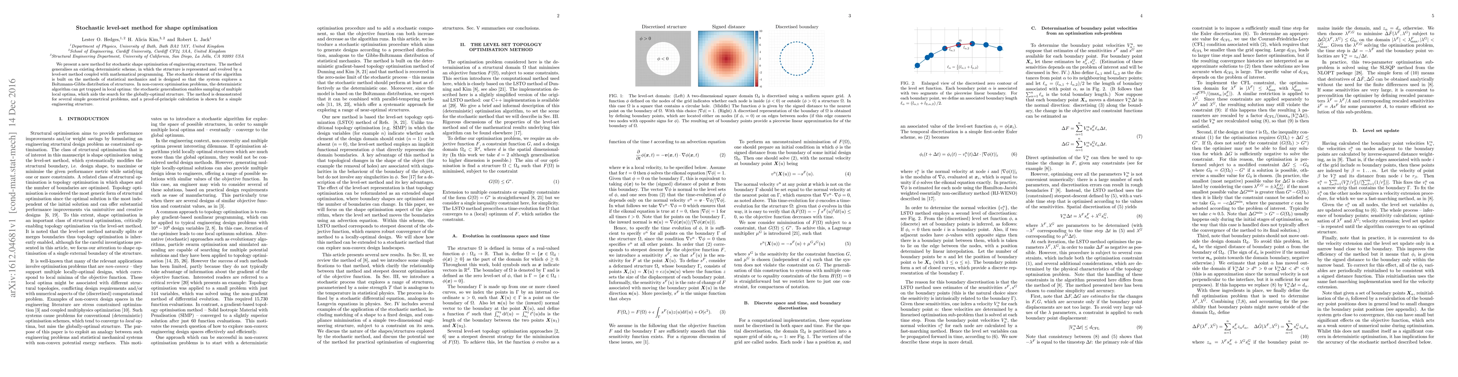 We present a new method for stochastic shape optimisation of engineering structures. The method generalises an existing deterministic scheme, in which the structure is represented and evolved by a level-set method coupled with mathematical programming. The stochastic element of the algorithm is built on the methods of statistical mechanics and is designed so that the system explores a Boltzmann-Gibbs distribution of structures. In non-convex optimisation problems, the deterministic algorithm can get trapped in local optima: the stochastic generalisation enables sampling of multiple local optima, which aids the search for the globally-optimal structure. The method is demonstrated for several simple geometrical problems, and a proof-of-principle calculation is shown for a simple engineering structure.