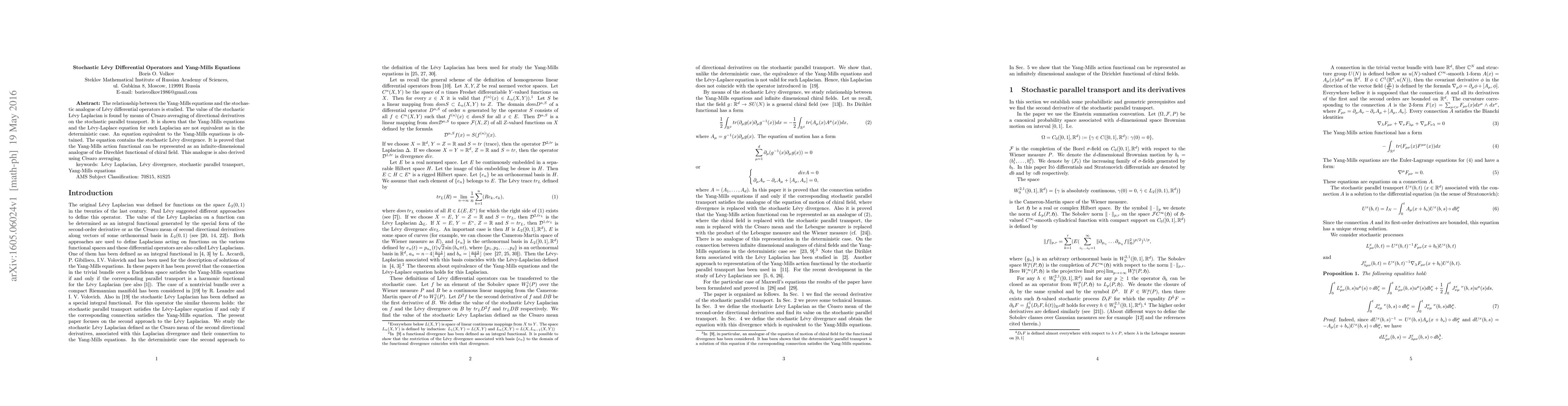 This paper explores the connection between Yang-Mills equations and stochastic Lévy differential operators, demonstrating that while the deterministic equivalence does not hold, an equivalent equation involving the stochastic Lévy divergence is derived. The Yang-Mills action functional is represented as an infinite-dimensional analogue of the Dirichlet functional of a chiral field, derived via Cesaro averaging.