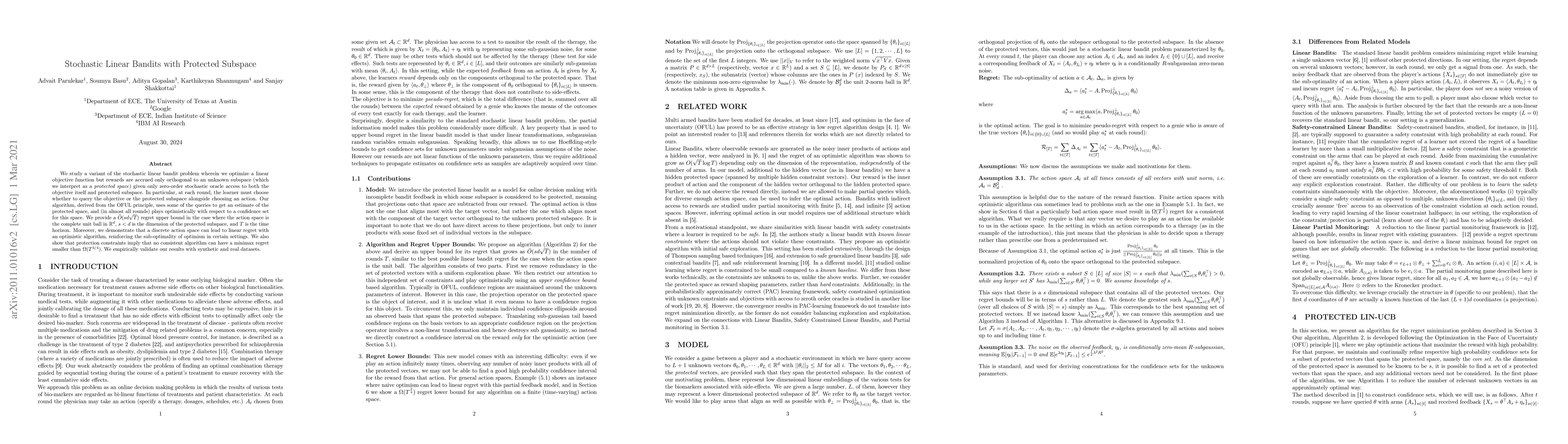 This paper studies a variant of stochastic linear bandits with a protected subspace, proposing an algorithm that balances exploration and exploitation to achieve near-optimal regret bounds, while also demonstrating the limitations of optimism in certain settings.