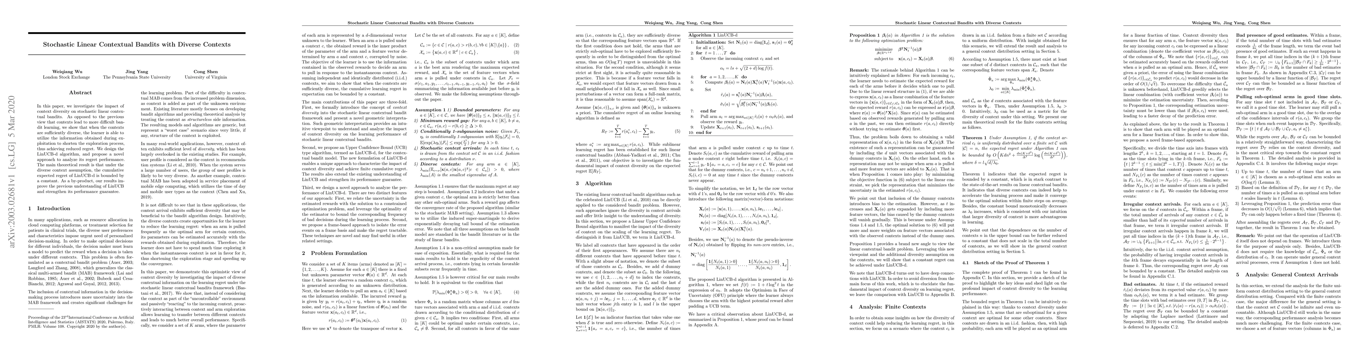 This paper explores how diverse contexts in stochastic linear contextual bandits can lead to reduced regret by leveraging exploitation information to shorten exploration. The LinUCB-d algorithm is introduced, and its theoretical analysis shows that under diverse context conditions, the cumulative expected regret is bounded by a constant, improving the understanding and performance of LinUCB.