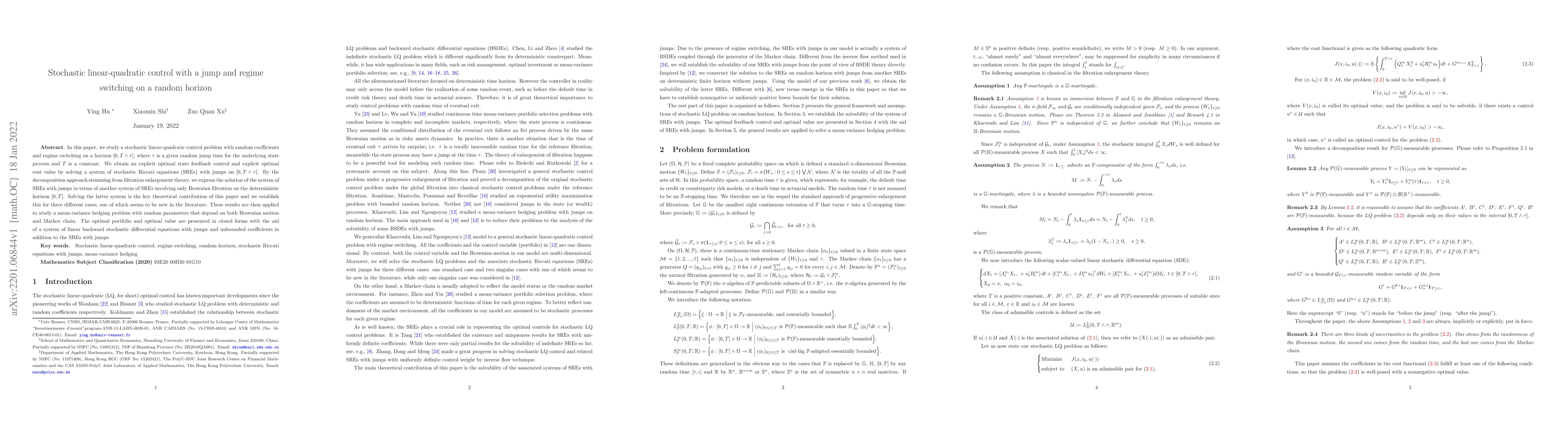 This paper addresses a stochastic linear-quadratic control problem with regime switching and a random jump time, solving it via a system of stochastic Riccati equations with jumps. The optimal control and cost are derived, and the results are applied to a mean-variance hedging problem with random parameters.