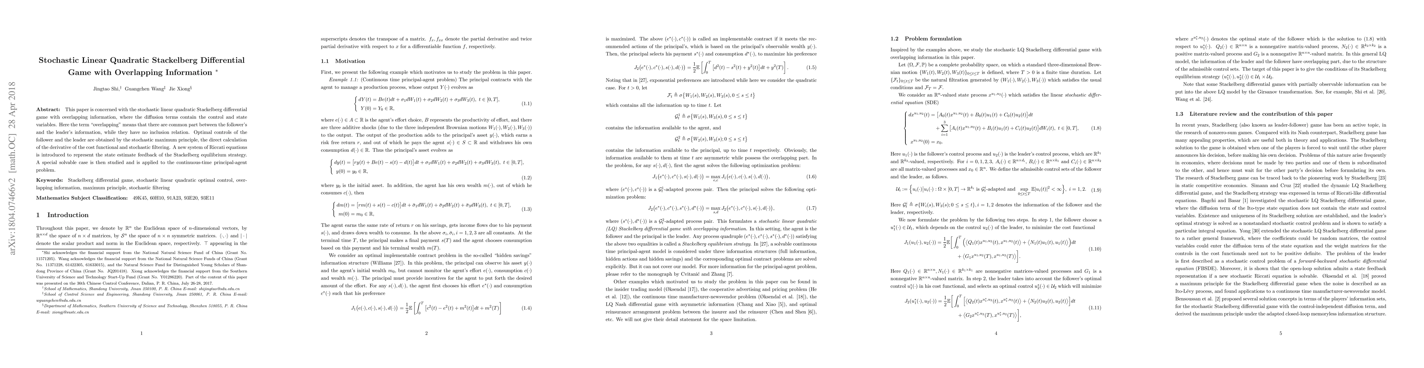 This paper investigates a stochastic linear quadratic Stackelberg differential game with overlapping information, deriving optimal controls using the stochastic maximum principle and introducing a new system of Riccati equations to represent the Stackelberg equilibrium strategy. A special case is analyzed and applied to a continuous-time principal-agent problem.