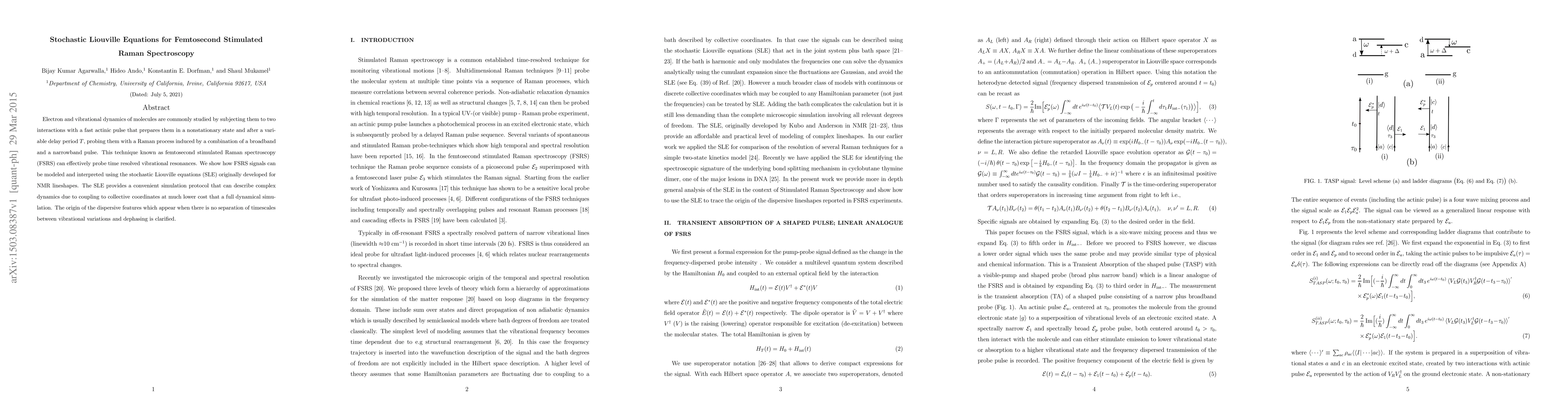 Electron and vibrational dynamics of molecules are commonly studied by subjecting them to two interactions with a fast actinic pulse that prepares them in a nonstationary state and after a variable delay period $T$, probing them with a Raman process induced by a combination of a broadband and a narrowband pulse. This technique known as femtosecond stimulated Raman spectroscopy (FSRS) can effectively probe time resolved vibrational resonances. We show how FSRS signals can be modeled and interpreted using the stochastic Liouville equations (SLE) originally developed for NMR lineshapes. The SLE provides a convenient simulation protocol that can describe complex dynamics due to coupling to collective coordinates at much lower cost that a full dynamical simulation. The origin of the dispersive features which appear when there is no separation of timescales between vibrational variations and dephasing is clarified.