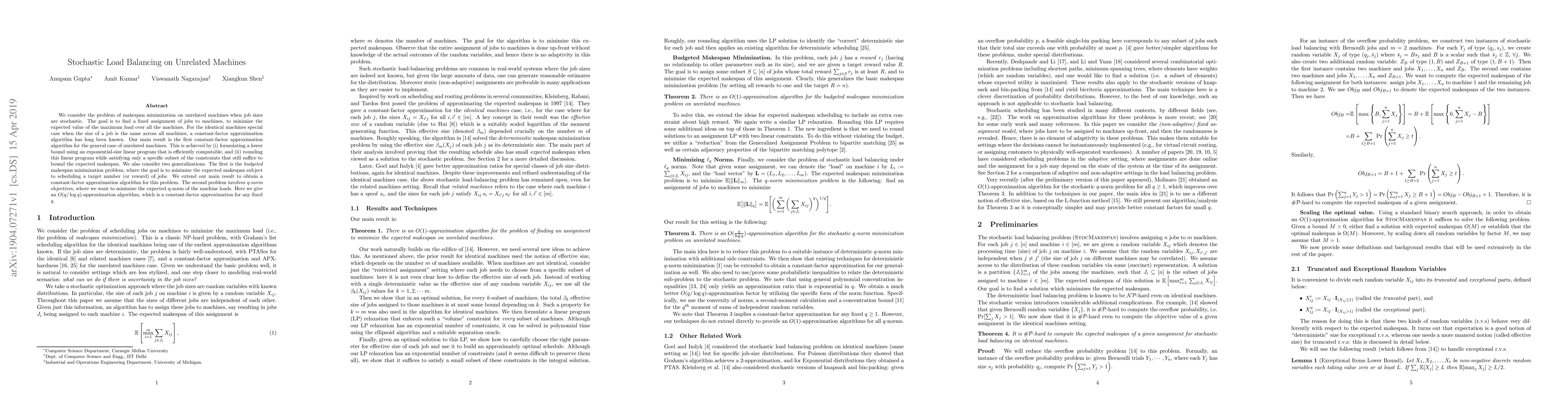 This paper presents the first constant-factor approximation algorithm for stochastic load balancing on unrelated machines to minimize the expected makespan. It also extends the algorithm to handle budgeted makespan minimization and provides an approximation for minimizing the expected q-norm of machine loads.