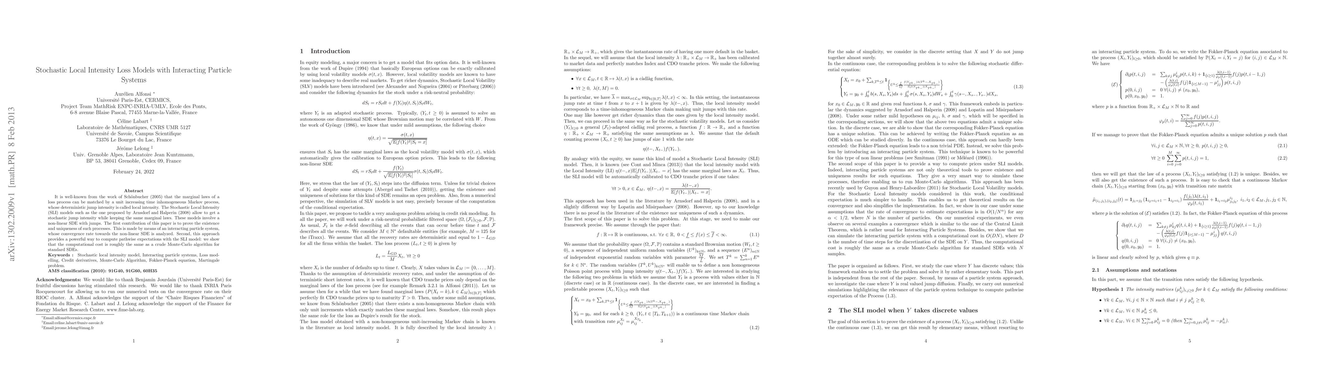 It is well-known from the work of Sch\"onbucher (2005) that the marginal laws of a loss process can be matched by a unit increasing time inhomogeneous Markov process, whose deterministic jump intensity is called local intensity. The Stochastic Local Intensity (SLI) models such as the one proposed by Arnsdorf and Halperin (2008) allow to get a stochastic jump intensity while keeping the same marginal laws. These models involve a non-linear SDE with jumps. The first contribution of this paper is to prove the existence and uniqueness of such processes. This is made by means of an interacting particle system, whose convergence rate towards the non-linear SDE is analyzed. Second, this approach provides a powerful way to compute pathwise expectations with the SLI model: we show that the computational cost is roughly the same as a crude Monte-Carlo algorithm for standard SDEs.