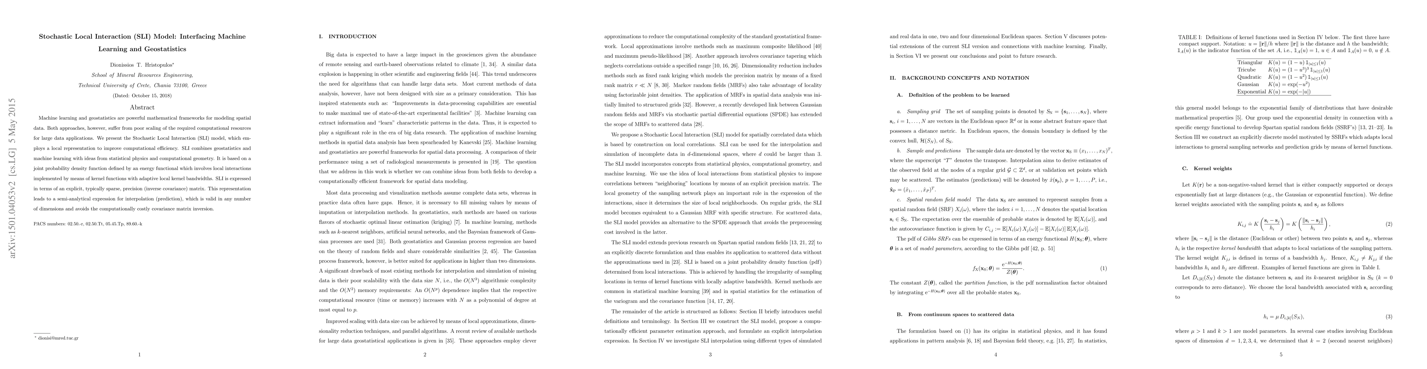 The Stochastic Local Interaction (SLI) model integrates machine learning and geostatistics using local representation to enhance computational efficiency for large spatial data sets. It employs a joint probability density function with local interactions and adaptive bandwidths, resulting in a sparse precision matrix that enables a semi-analytical, cost-effective interpolation method valid in any dimension.