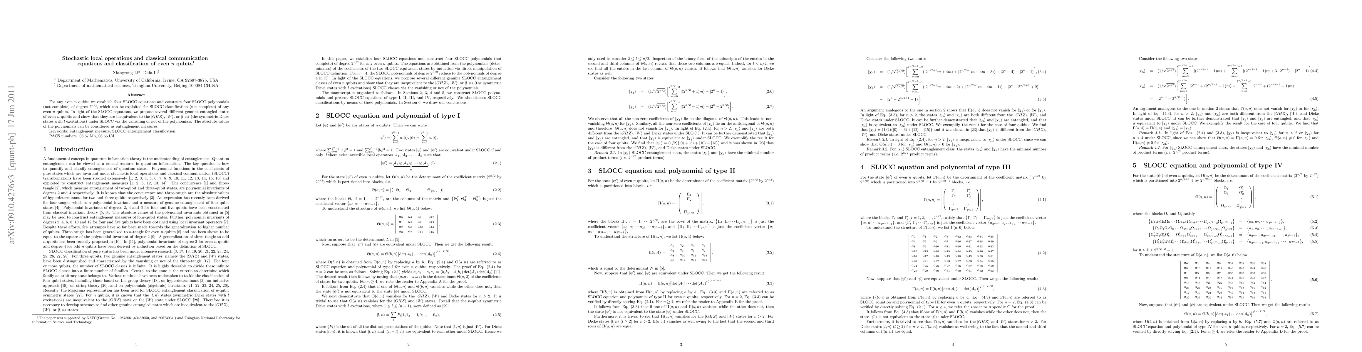 For any even $n$ qubits we establish four SLOCC equations and construct four SLOCC polynomials (not complete) of degree $2^{n/2}$, which can be exploited for SLOCC classification (not complete) of any even $n$ qubits. In light of the SLOCC equations, we propose several different genuine entangled states of even $n$ qubits and show that they are inequivalent to the $|GHZ>$, $|W>$, or $|l,n>$ (the symmetric Dicke states with $l$ excitations) under SLOCC via the vanishing or not of the polynomials. The absolute values of the polynomials can be considered as entanglement measures.
