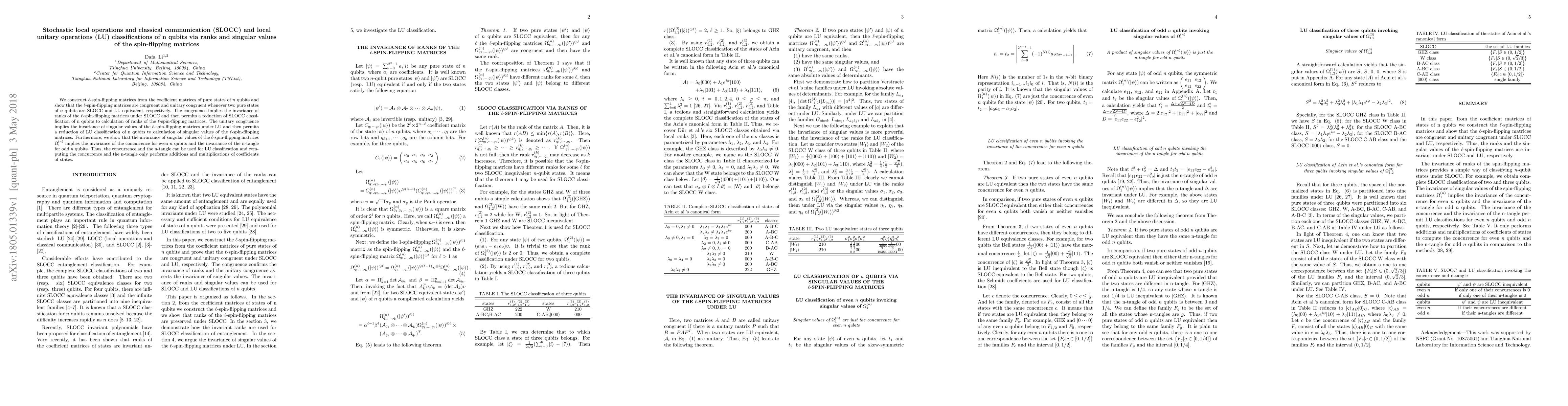 This paper demonstrates that SLOCC and LU classifications of n qubits can be reduced to calculating the ranks and singular values of spin-flipping matrices derived from pure state coefficients. The invariance of these matrices' properties under SLOCC and LU allows for simpler classification methods based on these values.
